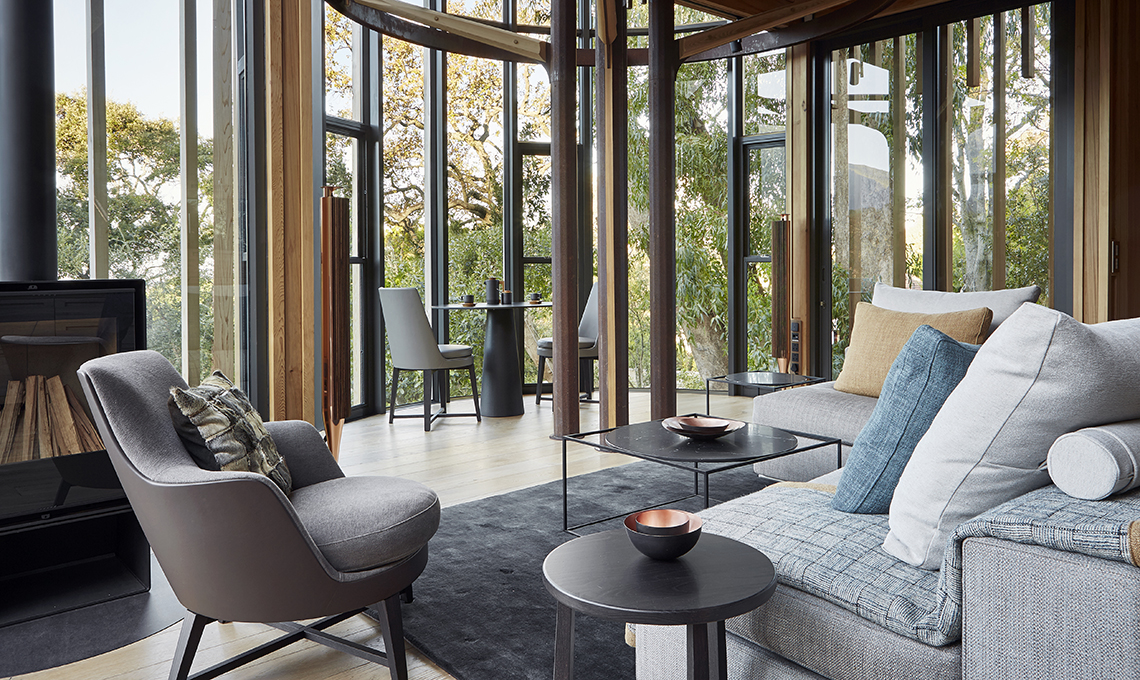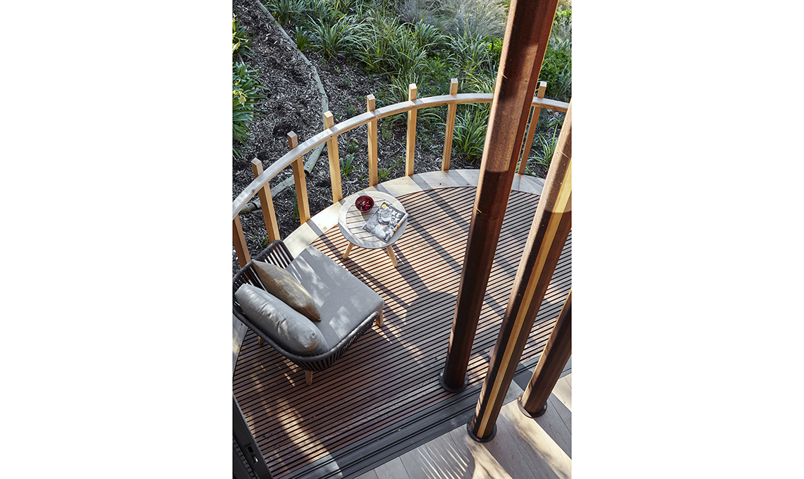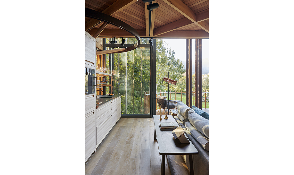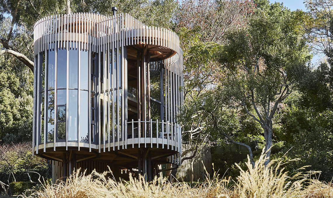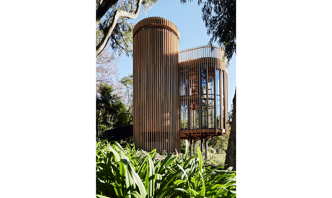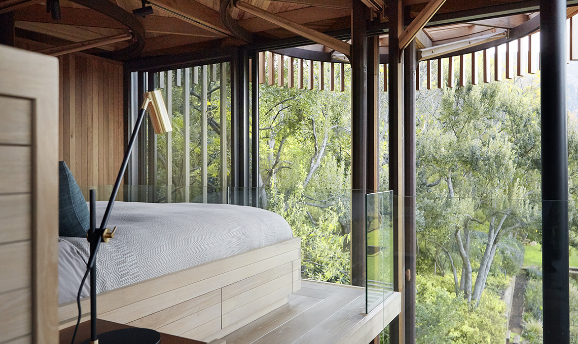Graham, il proprietario, voleva un nido tra il selvaggio e l’hi-tech, che ‘toccasse’ il cielo, per potersi ‘arrampicare’ come faceva da bambino sulla sua casa sull’albero: un desiderio soddisfatto sollevando la casa dal suolo come fosse una palafitta e sviluppandola in altezza con quattro luminosissime torri circolari che, come grandi rami della vita, permettono alla natura e alla luce di entrare in ogni angolo della casa e alla vista di godere di veri scorci mozzafiato, in qualunque direzione vengano volti gli sguardi. Un suggestivo e dinamico gioco geometrico di pieni e di vuoti, realizzato ricorrendo a strutture in acciaio, vetro e legno, il materiale che richiama le radici dell’abitare, usato anche per schermare le vetrate e collegare ‘dentro’ e ‘fuori’.