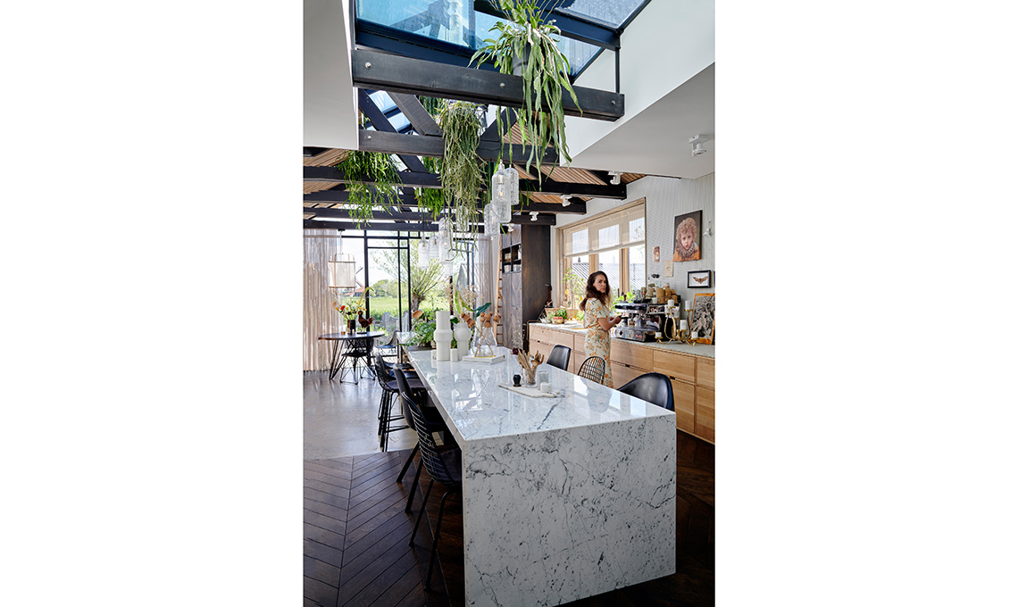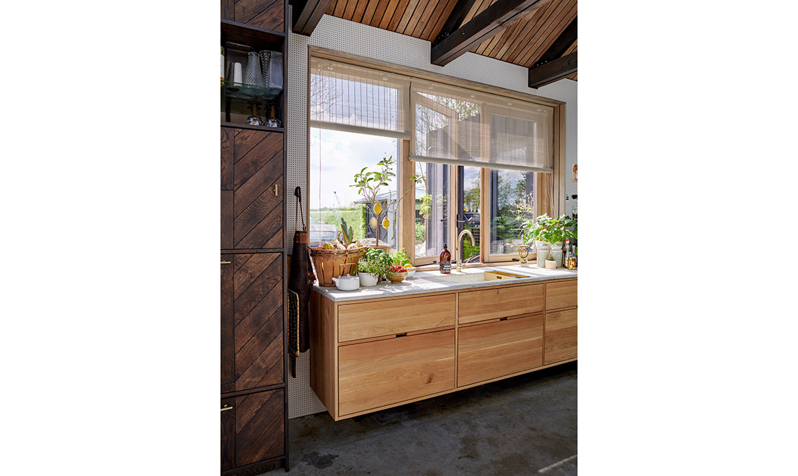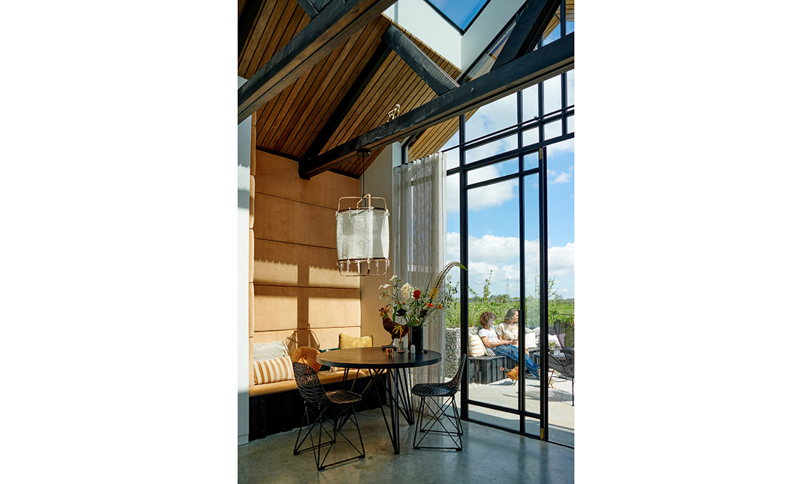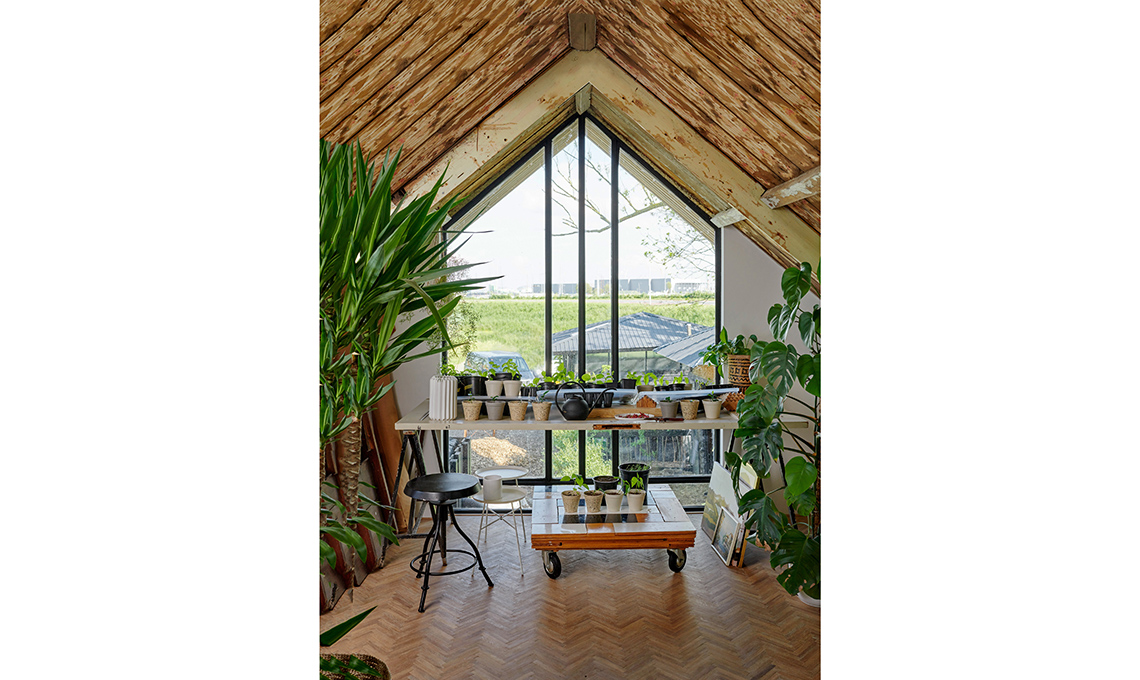e le serre che sono la quintessenza dei paesaggi che si vedono nei Paesi Bassi: una ‘casa verde’, con grandi finestre, travi a vista che evocano la sensazione di essere in un fienile, un dehors sullo stesso livello, perfettamente arredato.