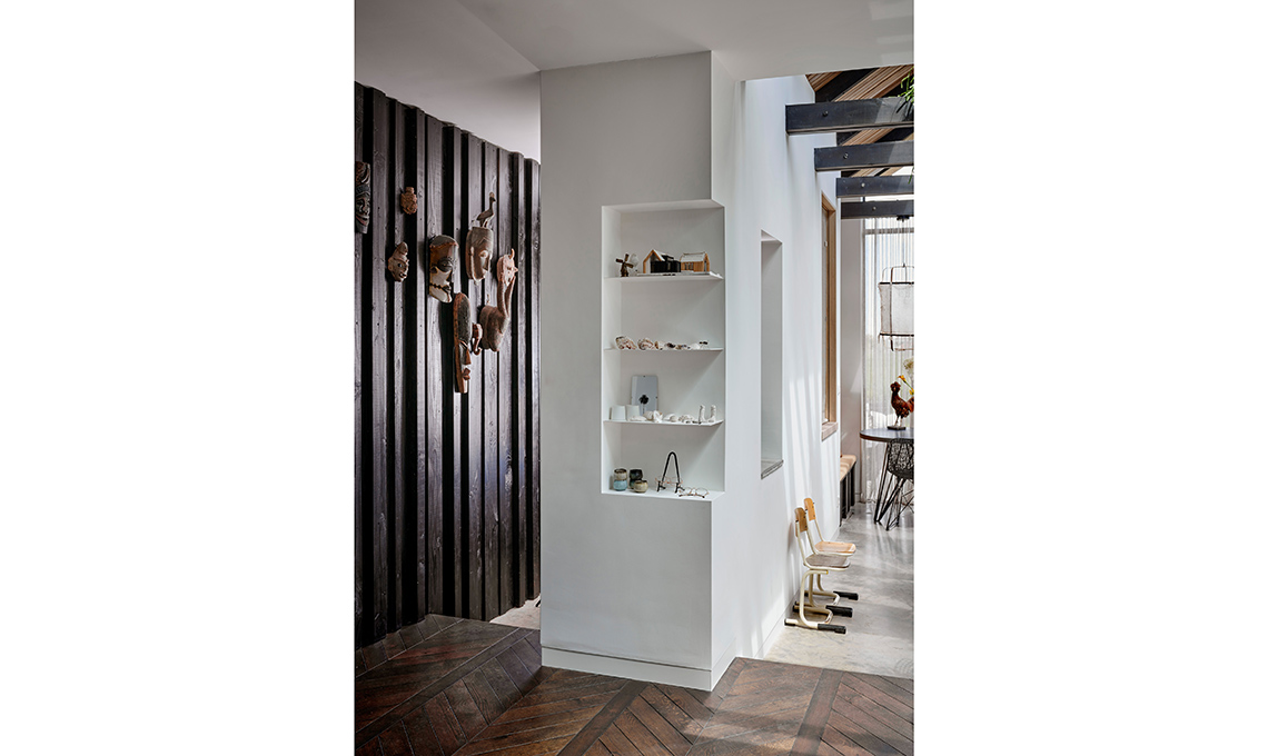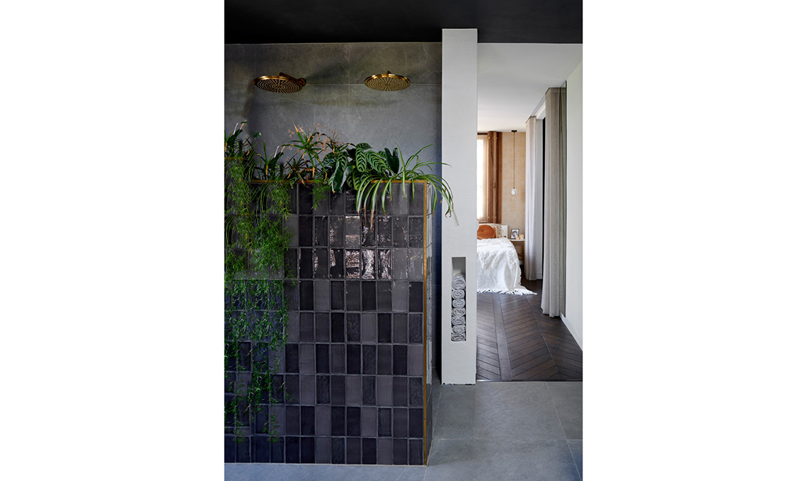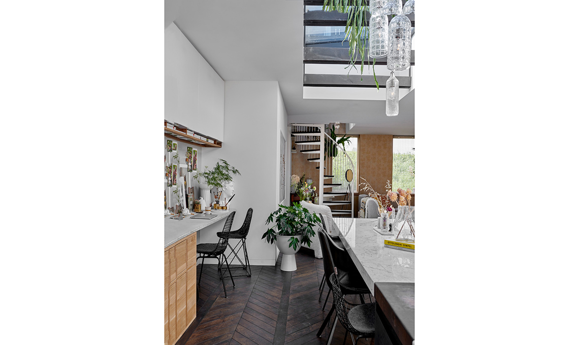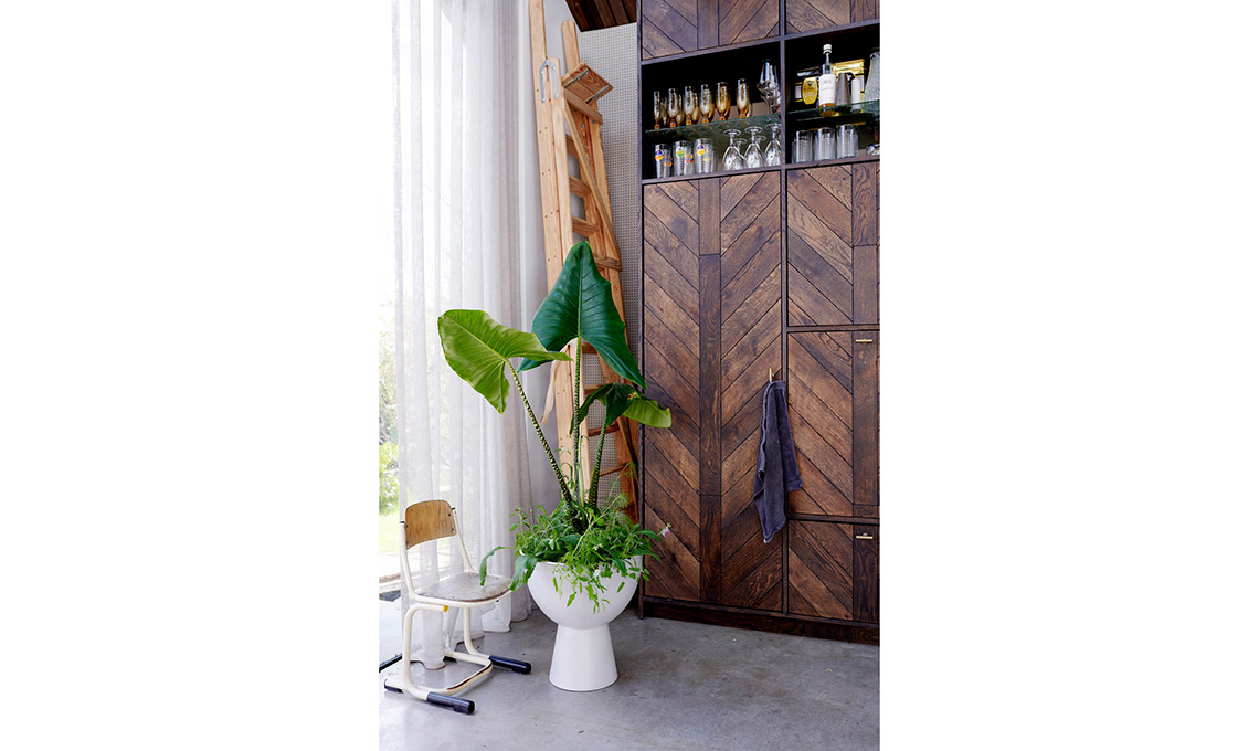 Per non spezzare la continuità visiva della zona giorno pensata come una serra tutta da vivere, Manon e Hugo hanno disegnato una lunghissima isola che da un lato fa da tavolo, ma dall’altro ospita la cucina, con i fuochi e i forni a incasso. Una serra, però, non sarebbe completa senza le piante, a cui è stato dato un posto soleggiato tra