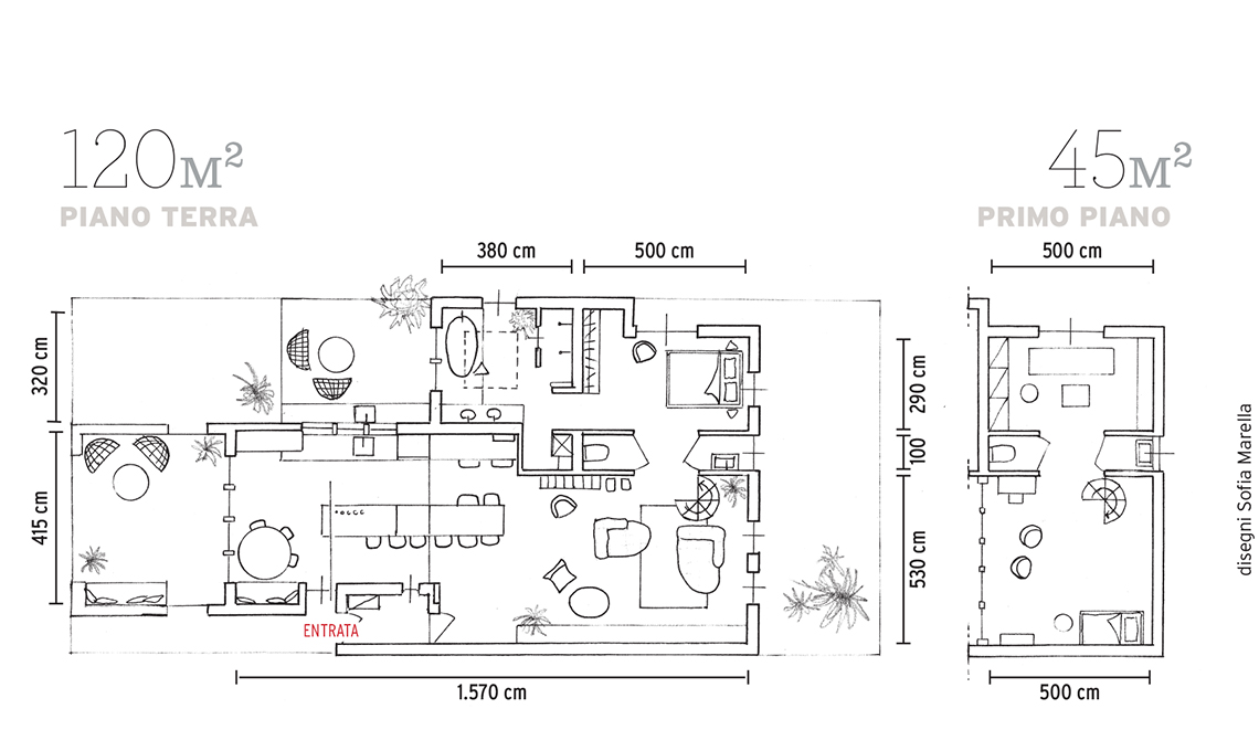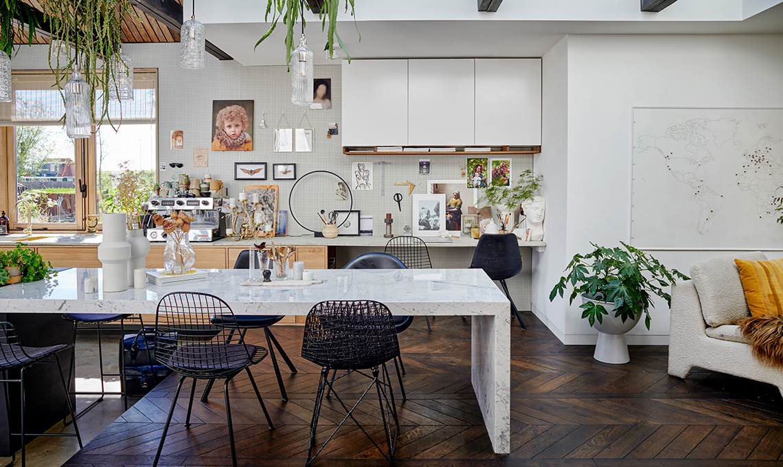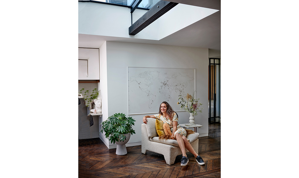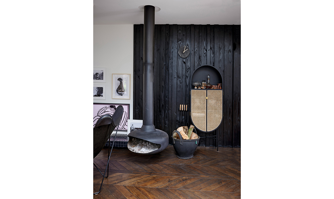 Per non spezzare la continuità visiva della zona giorno pensata come una serra tutta da vivere, Manon e Hugo hanno disegnato una lunghissima isola che da un lato fa da tavolo, ma dall’altro ospita la cucina, con i fuochi e i forni a incasso. Una serra, però, non sarebbe completa senza le piante, a cui è stato dato un posto soleggiato tra