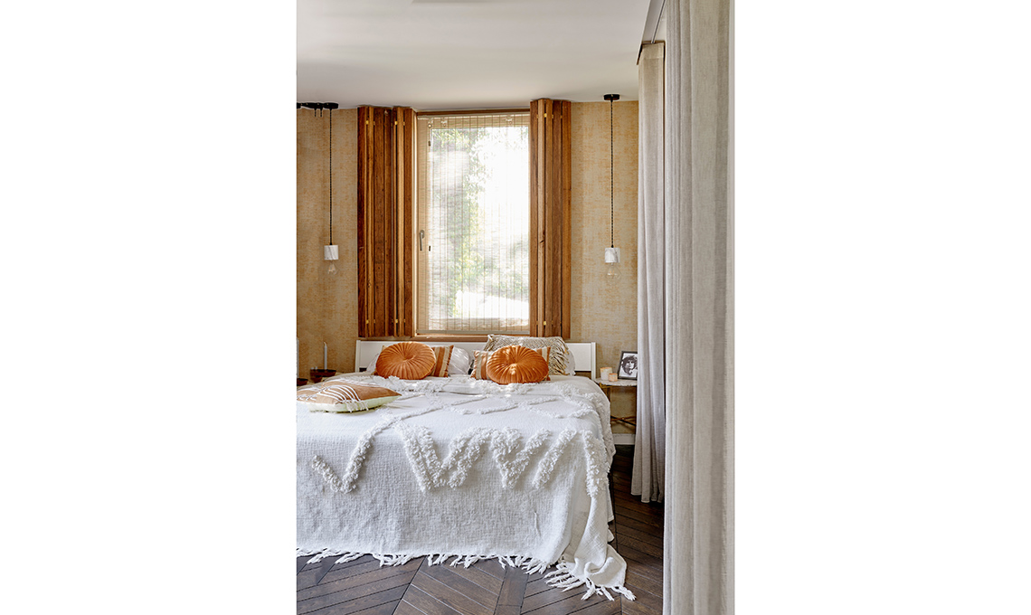 La camera è una morbida coccola, a iniziare dalla wallpaper color pesca. Alla finestra, il particolare della paratia in legno, che oscura quando serve, è un dettaglio da copiare.