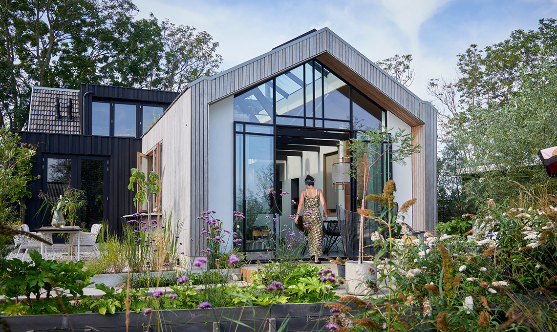 La casa ‘copia’ i granai neri tipici della zona e ha un approccio architettonico ‘biofilico’, cioè intreccia in ogni parte architettura e natura e gode dell’apertura massima verso il giardino, in corrispondenza di un ampliamento concepito come una serra.