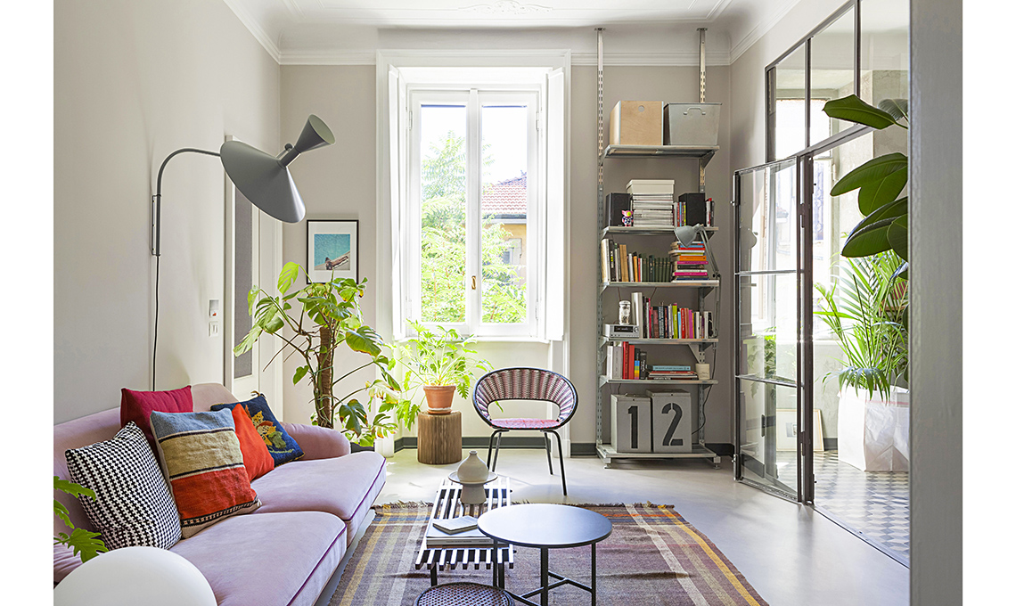 L’uso combinato di resina a pavimento, vetrata, scaffalature in metallo (industrial) con divano rosa e poltroncina multicolor (girly) dà molto carattere.