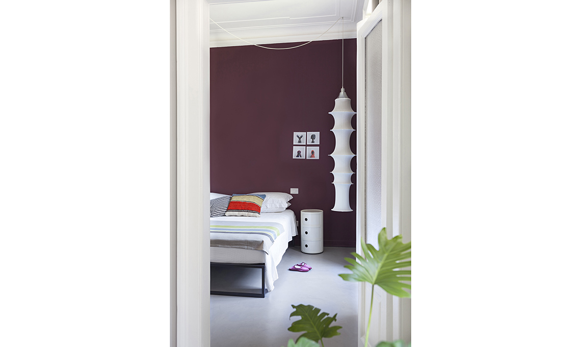 Letto Fronzoni ‘64 [Cappellini], lampada sospesa Falkland 165 di Bruno Munari [Danese€133], comodino Componibili [Kartell€118]. Colore a parete Brinjal [Farrow & Ball].