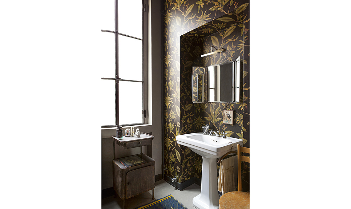 Sanitari Montebianco [Pozzi Ginori], specchio da parete a trittico [Chehoma], carta da parati che richiama i modelli Byron 94, Contemporary Restyled-Lily e New Contemporary- Palm Leaves di [Cole & Son].