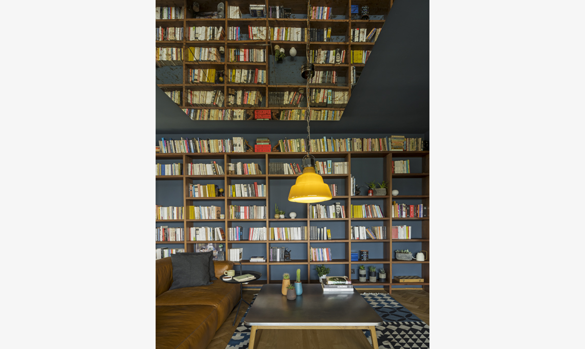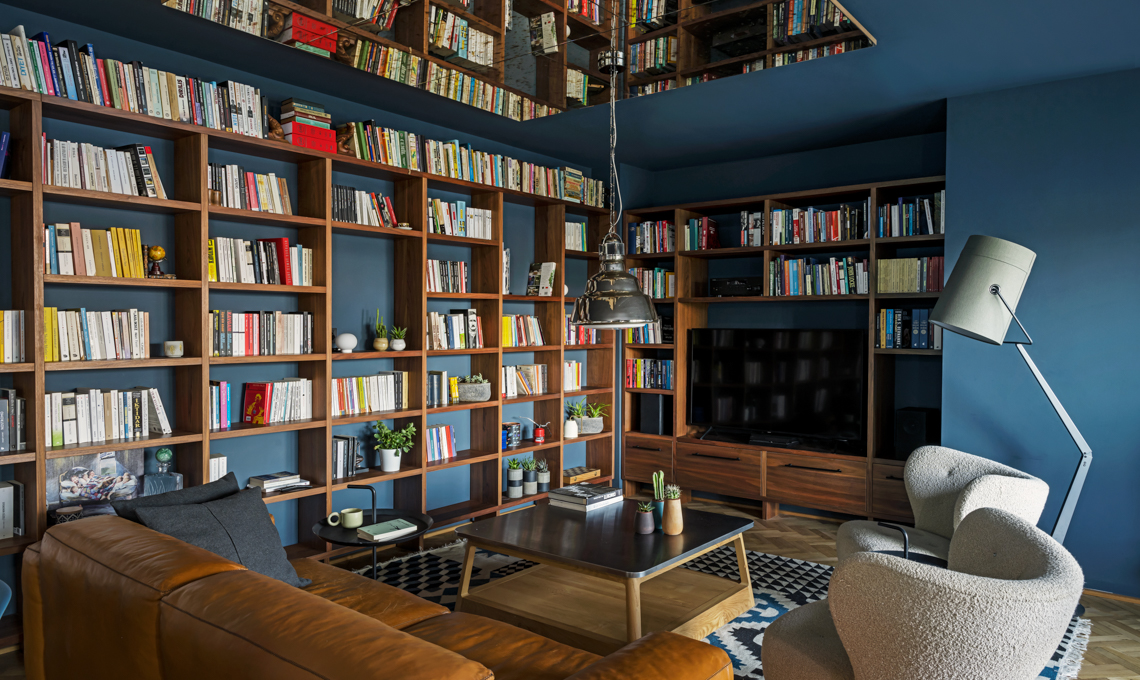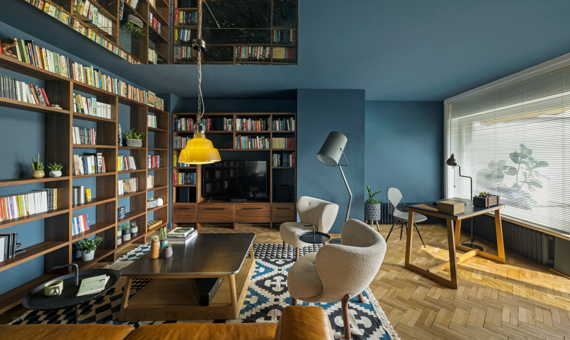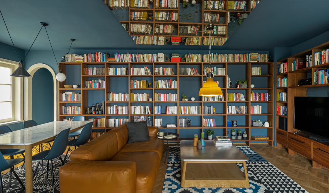 Tutto intorno, una grande libreria organizzata in modo da alternare i libri con piccole piante e oggetti decorativi, che lasciano spazio al blu di fondo. Il trucco per ampliare visivamente lo spazio? Sul soffitto è stato collocato un grande specchio. La scrivania completa la zona living: si affaccia sulla terrazza, così da godere di luce naturale.
