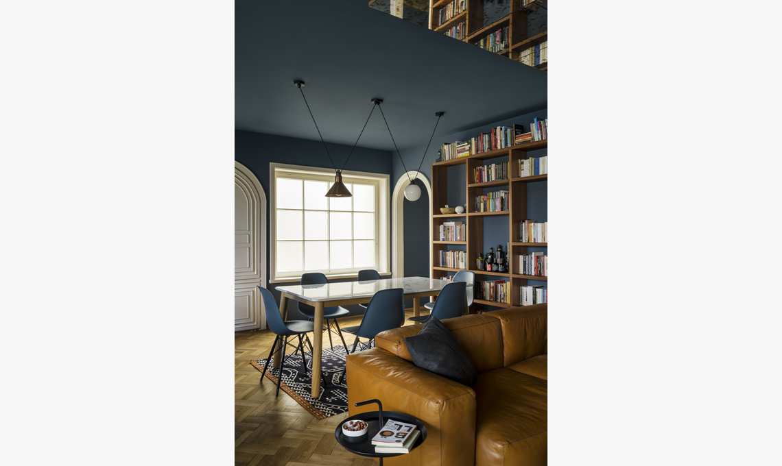 Una casa urbana, calma, pacifica, funzionale, in cui il blu è diventato l'elemento principale per ottenere integrità spaziale, continuità, spaziosità, racchiudendo pareti e soffitti, eliminando la sensazione soffocante dei soffitti bassi.