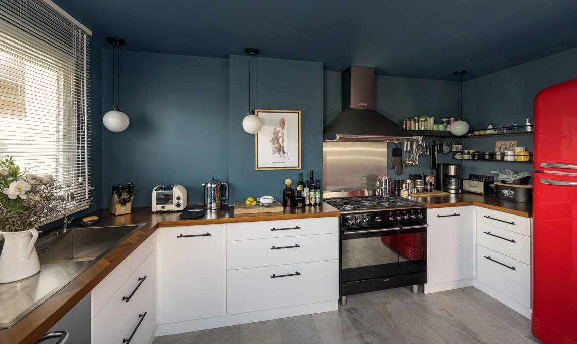 La cucina è stata completamente rinnovata, in modo da essere spaziosa e funzionale. Ha solo mobili bassi con pochi pensili a giorno, adatti a tenere a portata di mano spezie e stoviglie di uso quotidiano. Al blu delle pareti, si accosta il bianco della cucina, con top in legno e maniglie nere, e il rosso del grande frigorifero.
