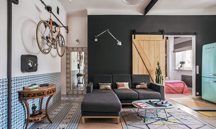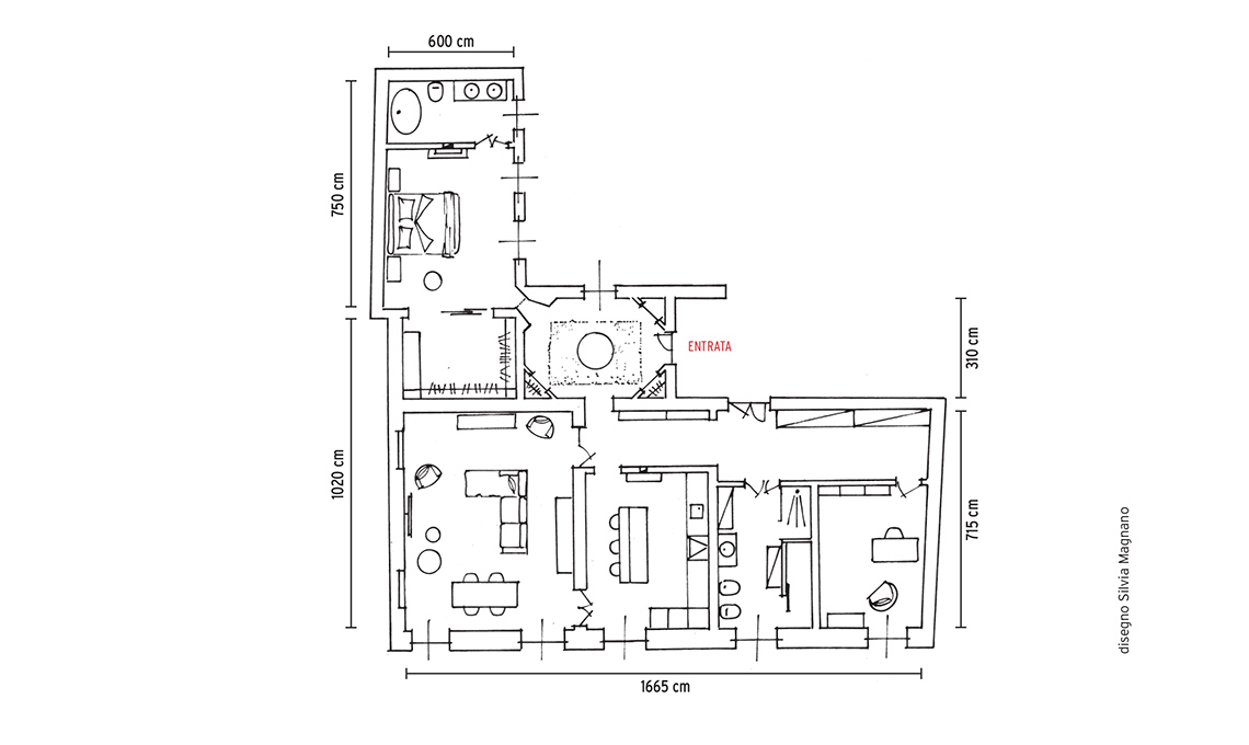 richiama l’affresco e uno stile che dà un piglio ’rock’. Il mix di pouf, sgabelli e tavolini sostituisce l’idea del coffee table unico.