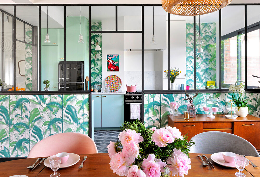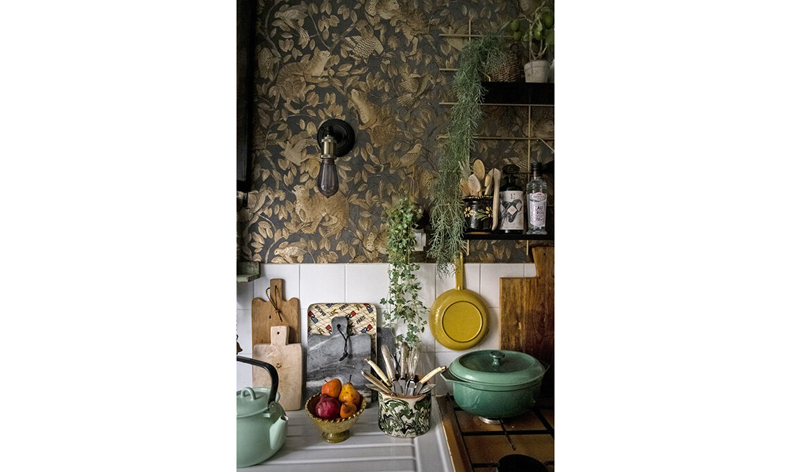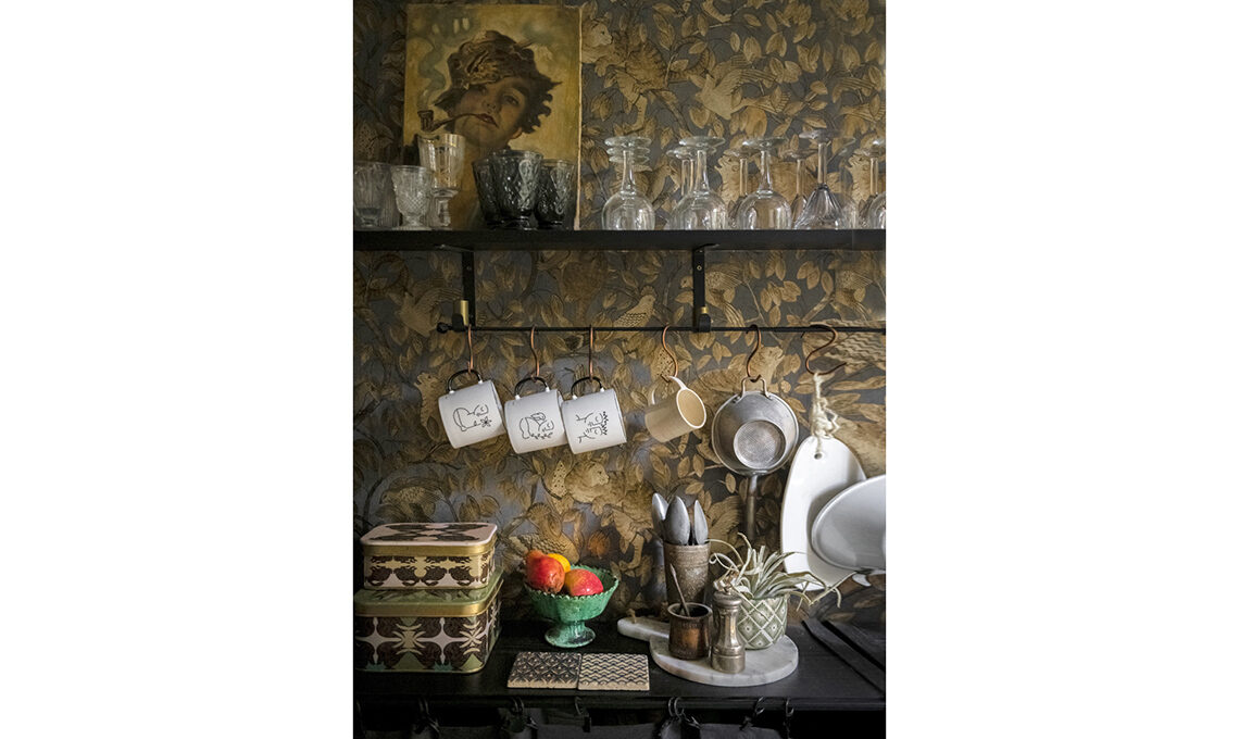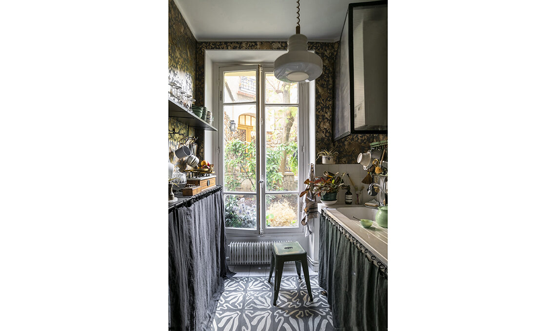 «Contrariamente a quanto si è portati a pensare, sono gli spazi piccoli come questa cucina che vanno iperdecorati osando anche i toni scuri. Questo li rende interessanti e magnetici!» dice Aude.
