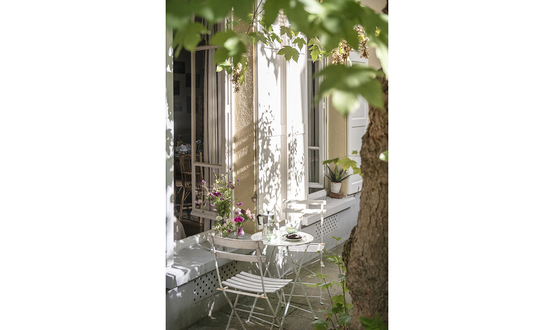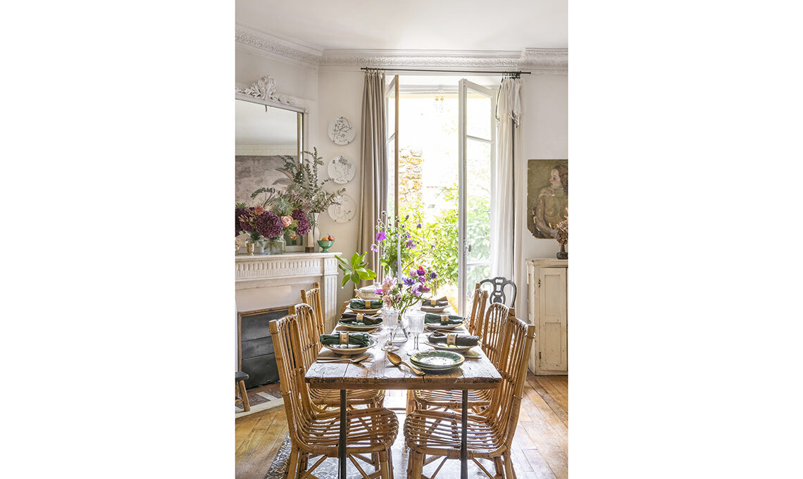 Aude, per la sua casa seleziona solo mobili essenziali e leggeri di brocantage (come quelli da esterno per il pranzo), che spesso poi cambia e rivende. Nel