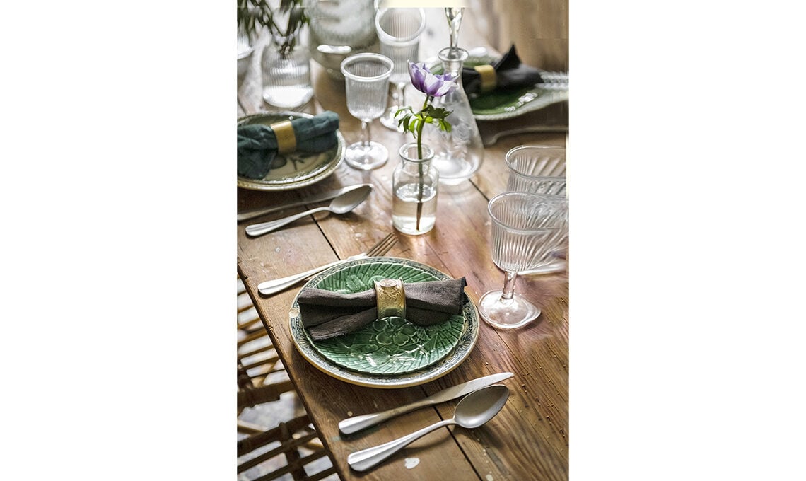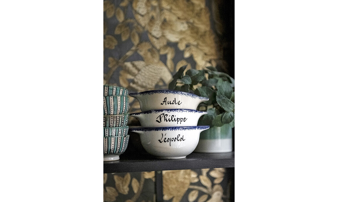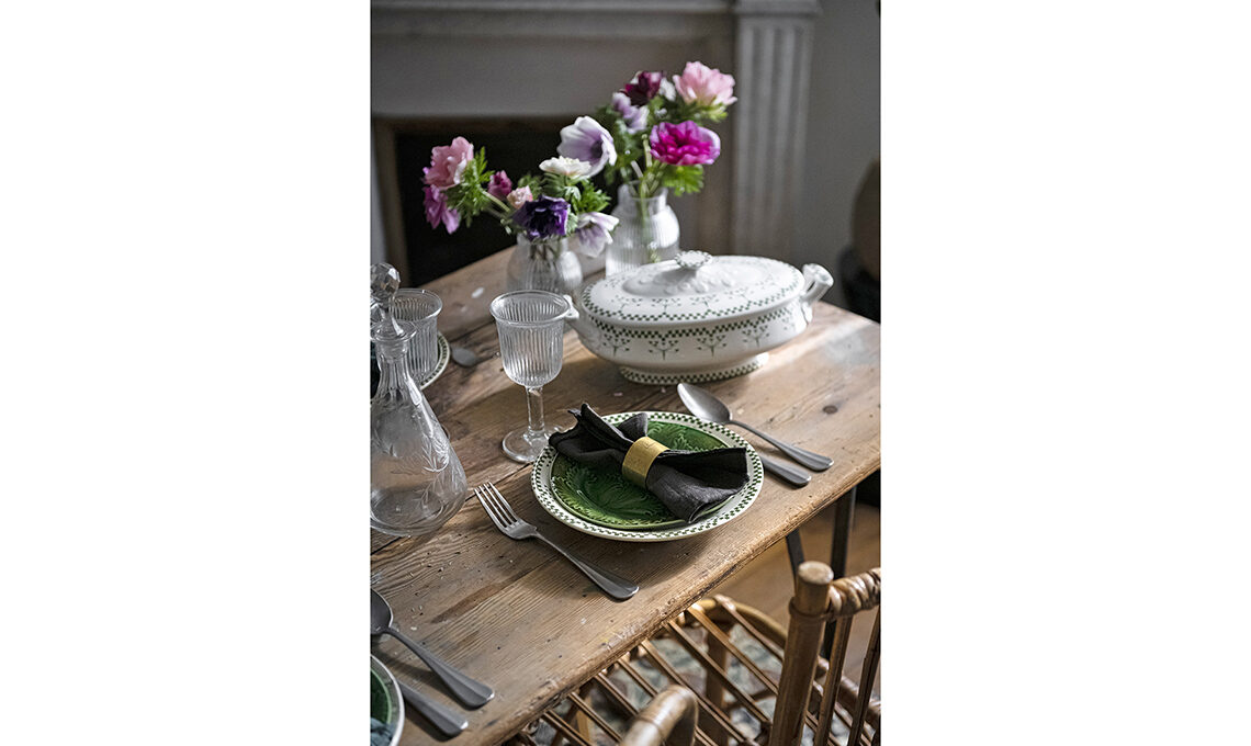 l segreto della tavola di Aude così semplice e piena di fascino? Niente tovaglia (se il tavolo ha un bel piano) e il mix di servizi antichi e moderni con un colore dominante come il verde dei tovaglioli e dei piatti Barbotines.