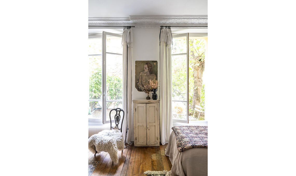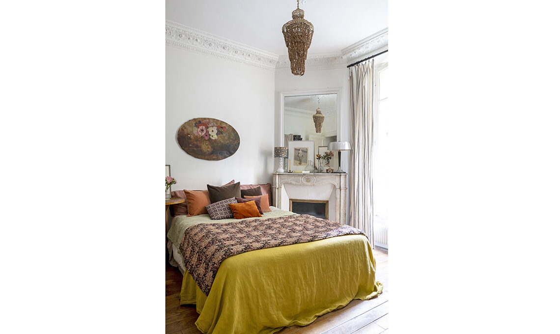 Quadro antico e stampa giapponese [Lilas Antiquités], copriletto trapuntato [Le Monde Sauvage], lenzuola in lino [Harmony Textile].