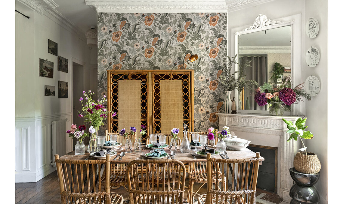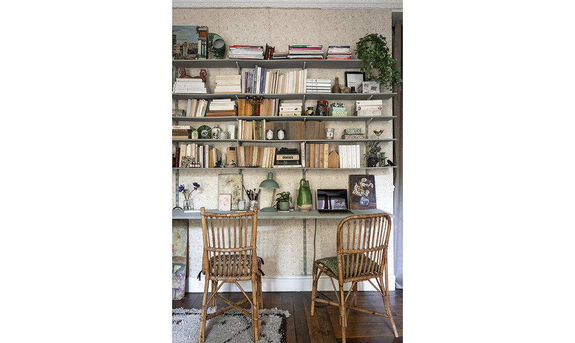 Mensole di recupero riverniciate in verde mat come i montanti a cremagliera e un semplice piano di lavoro formano un angolo smartworking davvero affascinante (oltre che pratico!). Ma la metà del lavoro di décor lo fanno la carta da parati sfumata, che aggiunge un effetto consumato dal tempo, e le sedie in bambù!
