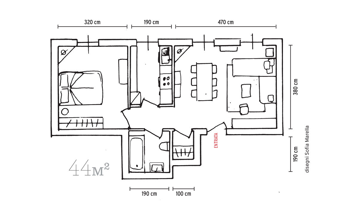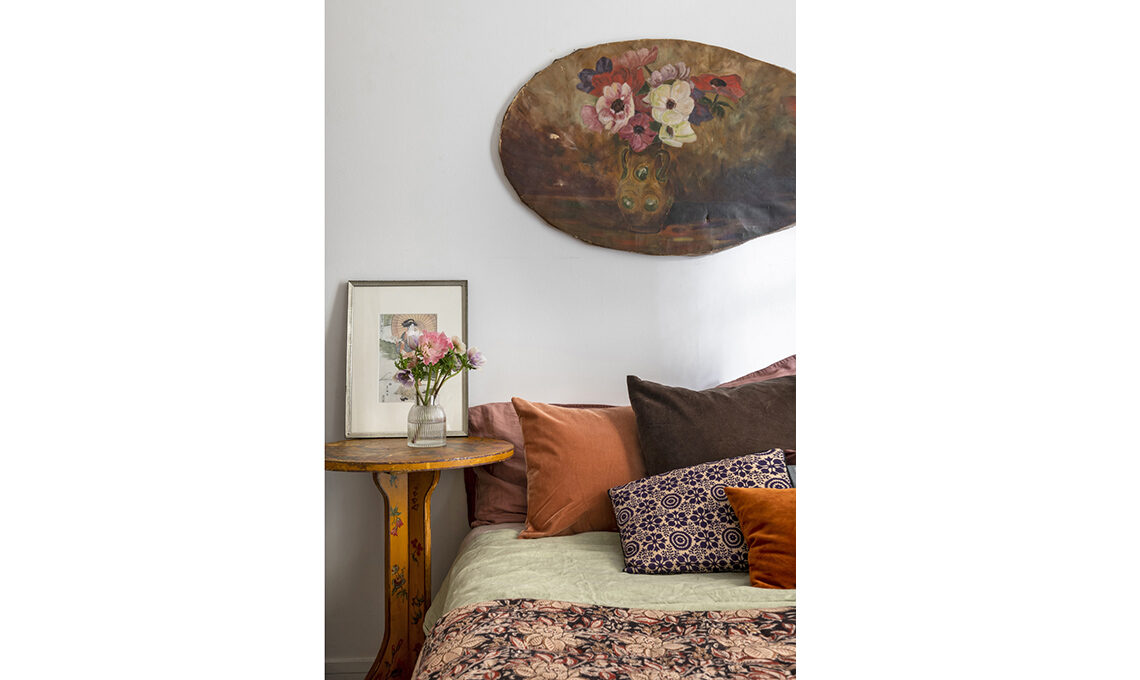Aude, che disegna anche tessuti, ha scelto cuscini e copriletto