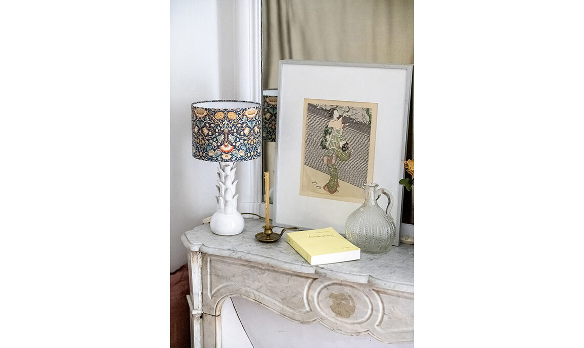 che richiamano i toni del quadro. Il mood rustico-parigino è dato anche dal camino in marmo e dalle lampade.