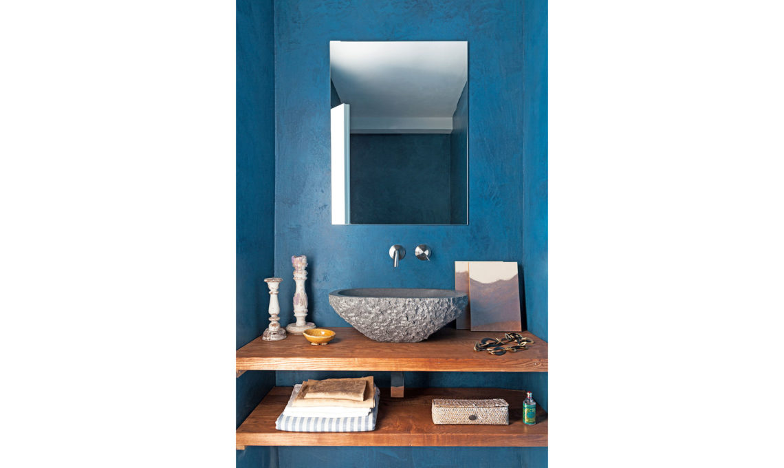 Parete e pavimento in marmo travertino, quadro di Vito Stassi, biancheria [Society]. La palette cromatica si ispira ai toni caldi dei Faraglioni. Sempre bella l’idea delle mensole in muratura, che potresti chiudere con antine a scorrimento.