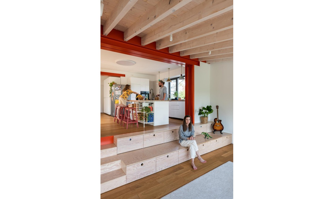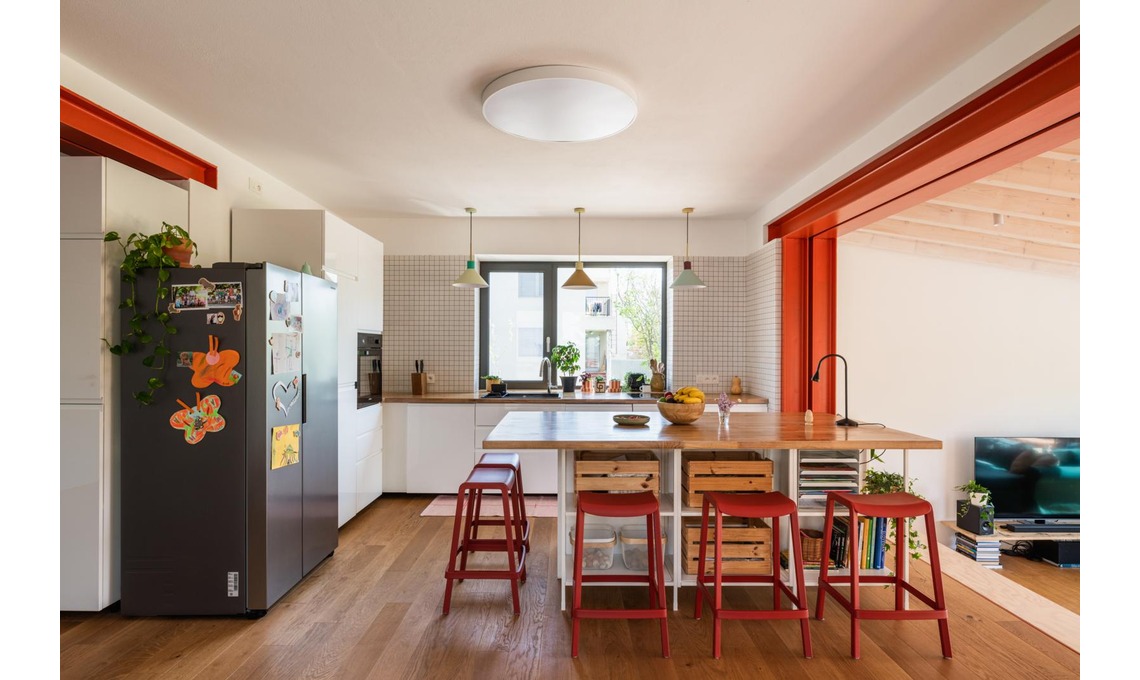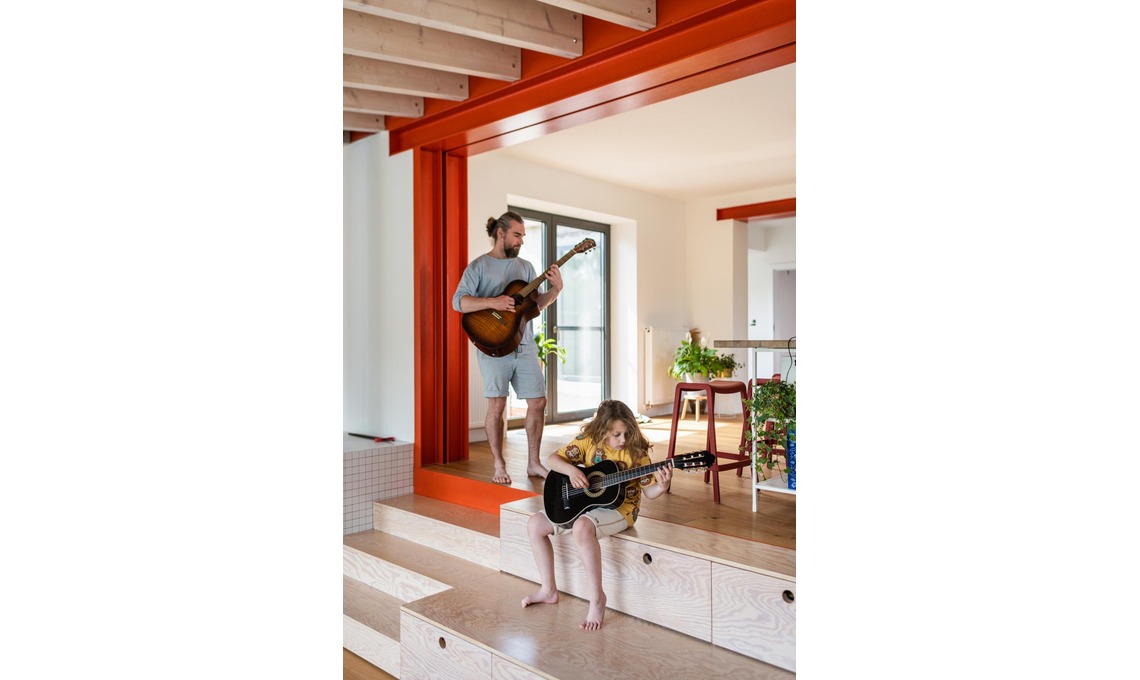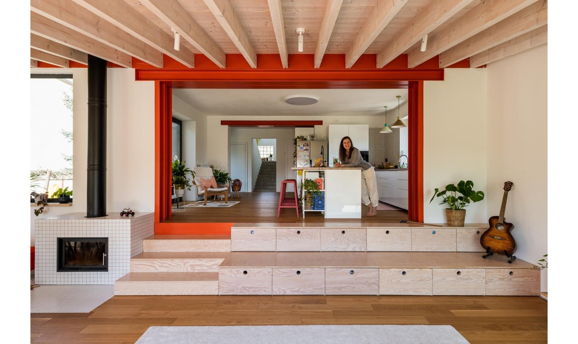 Jana, direttrice di un asilo privato, vive in questa casa con il marito Martin, dirigente di una multinazionale, e i loro 3 figli. Qui ci sorride dalla cucina che si apre sul living e lo sovrasta di circa 70 centimetri. Due gli elementi che catturano l’occhio: la ‘cornice’ rossa formata dalla grande trave e dai suoi montanti e la ‘gradinata’ con tanti cassettoni che diventa area gioco-relax.