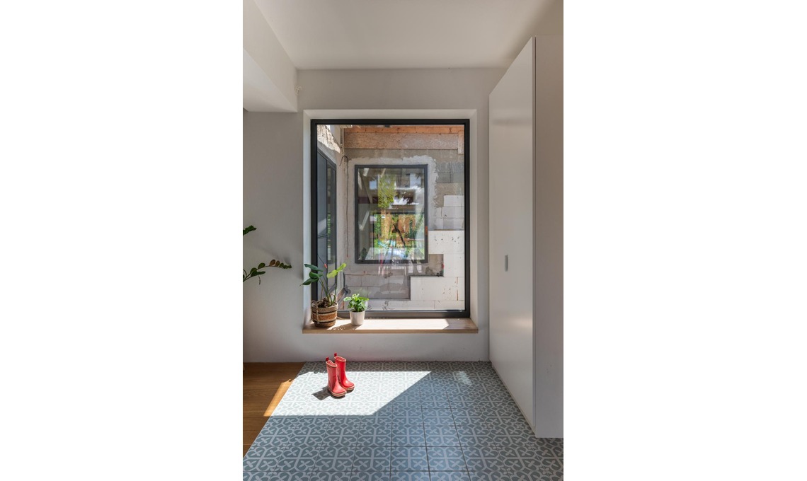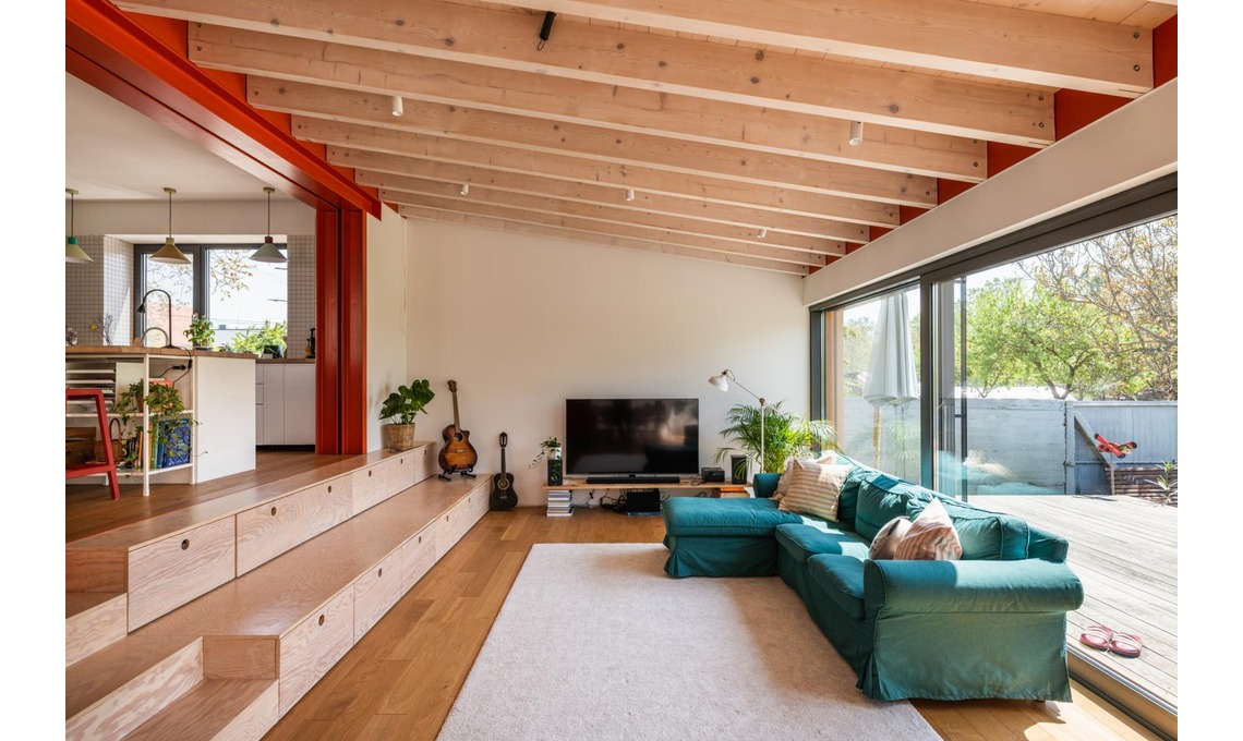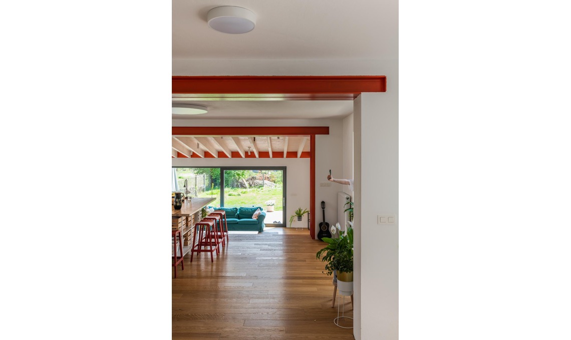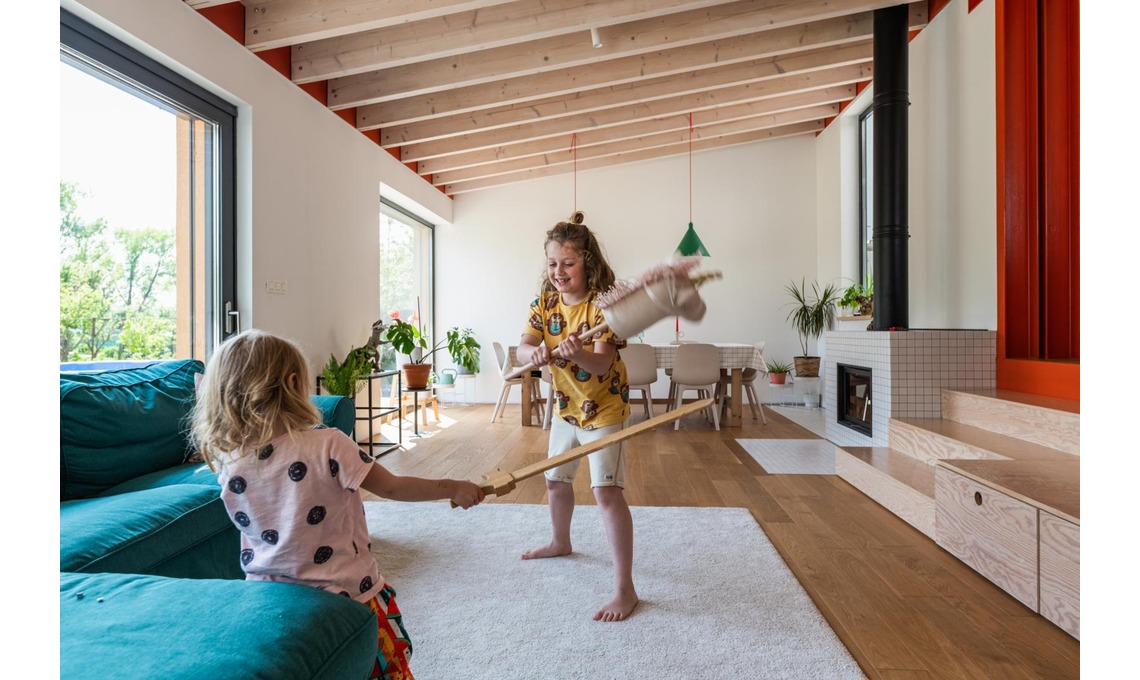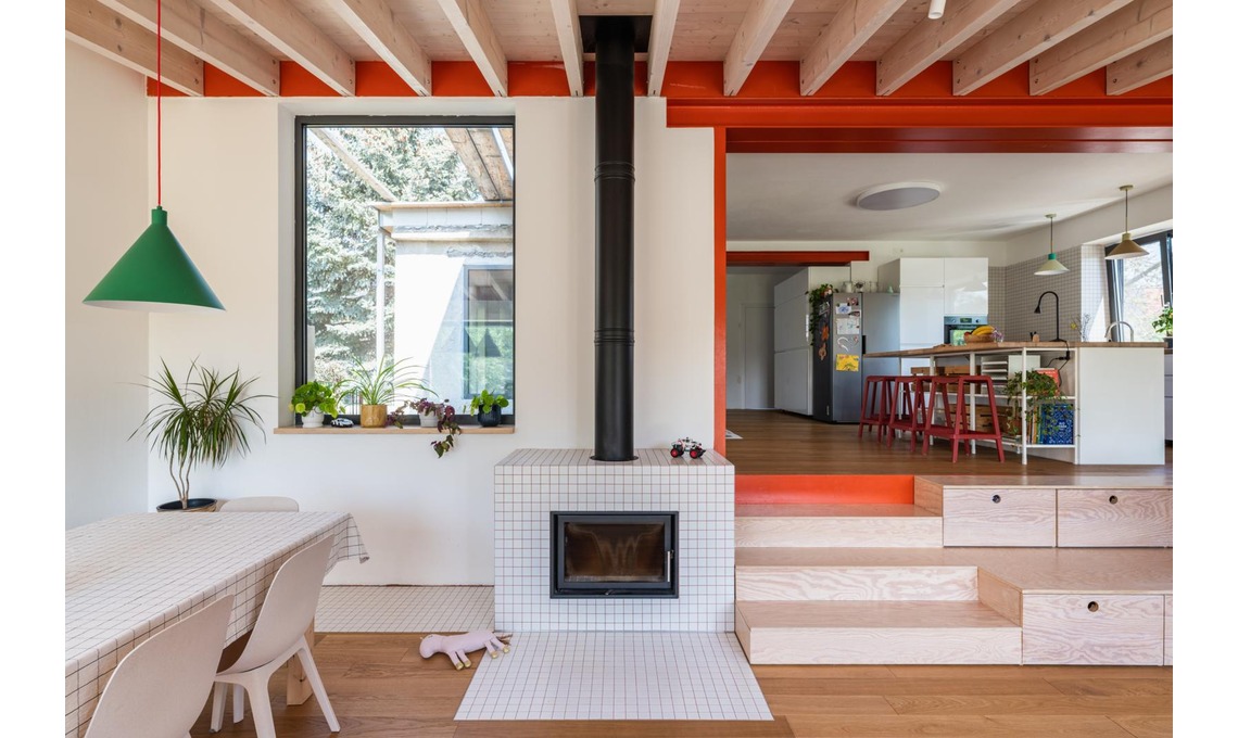 Jana, direttrice di un asilo privato, vive in questa casa con il marito Martin, dirigente di una multinazionale, e i loro 3 figli. Qui ci sorride dalla cucina che si apre sul living e lo sovrasta di circa 70 centimetri. Due gli elementi che catturano l’occhio: la ‘cornice’ rossa formata dalla grande trave e dai suoi montanti e la ‘gradinata’ con tanti cassettoni che diventa area gioco-relax.