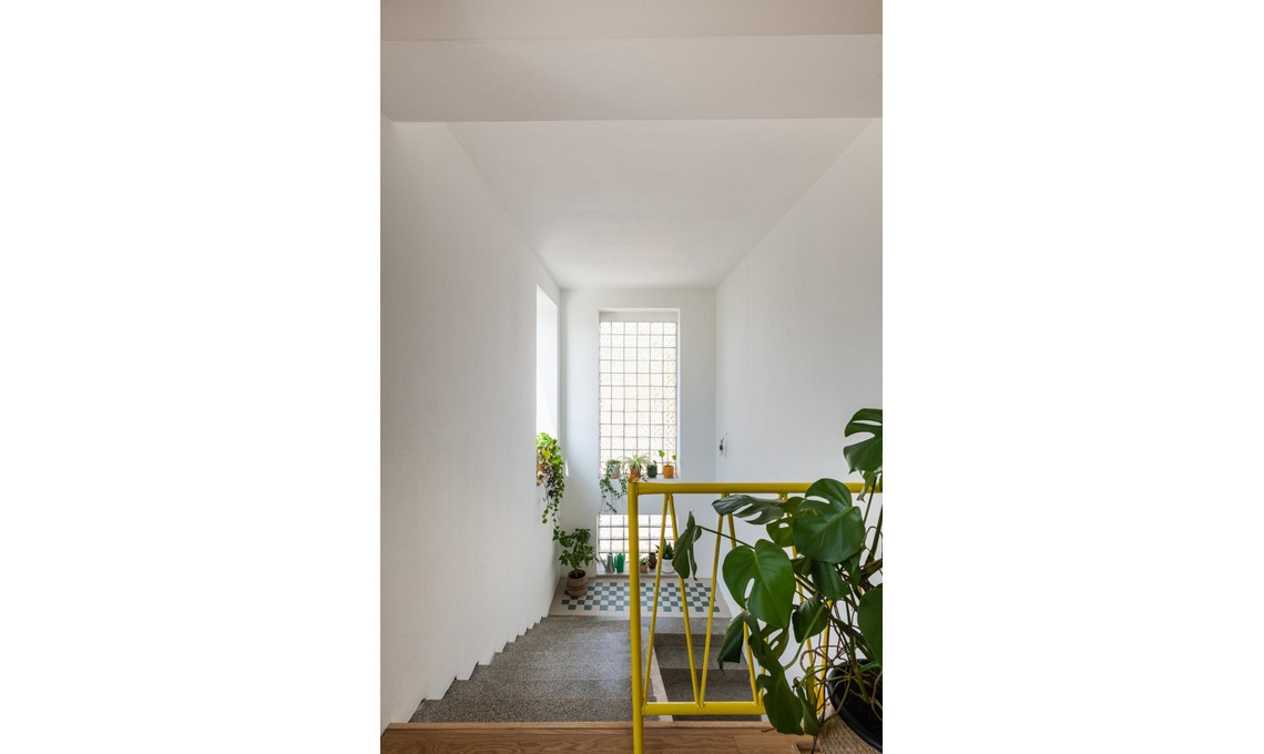 Tra le due rampe di scale c’è un delizioso pianerottolo piastrellato a scacchi. E la ringhiera, originale anch’essa, con un colore giallo acceso diventa subito protagonista!