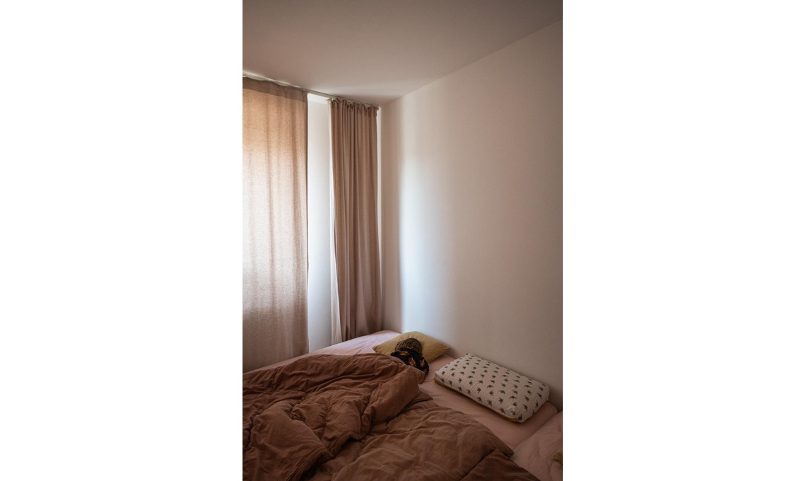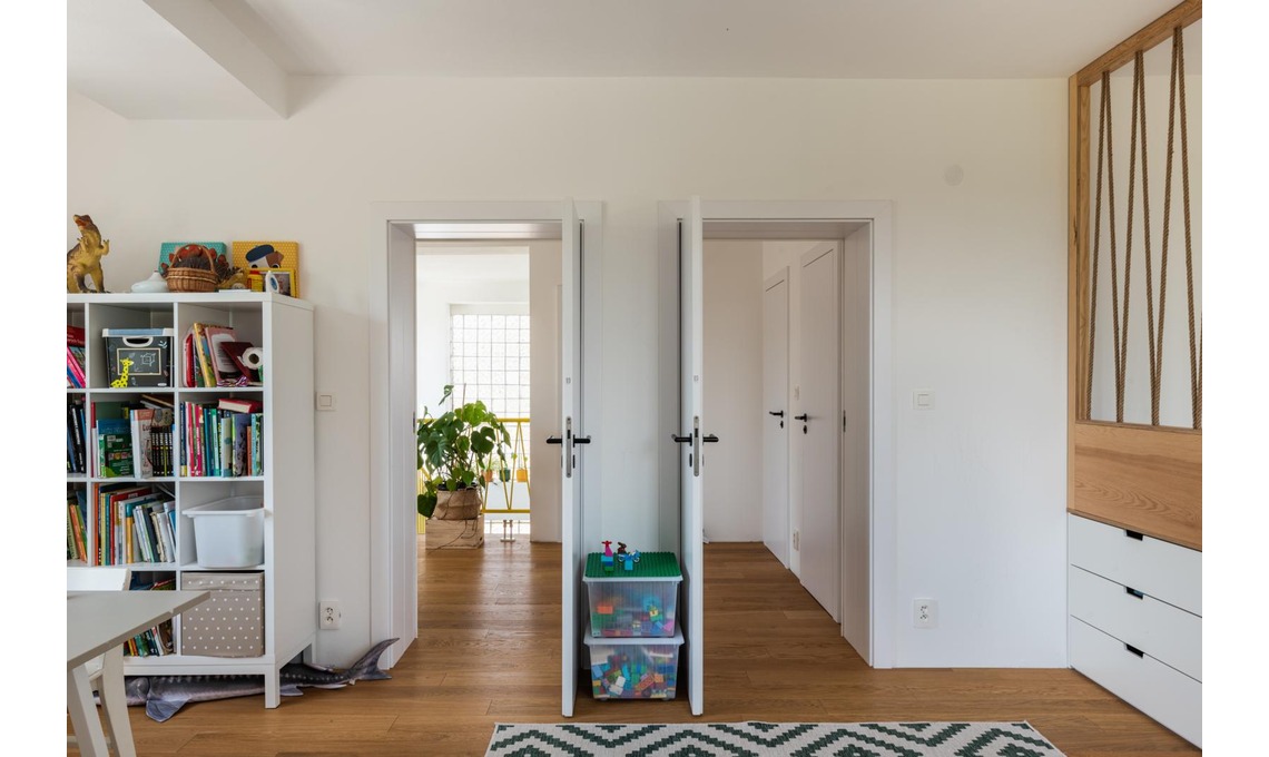 La spaziosa camera da letto ospita tutti e tre i figli di Jana e Martin. Ma verrà presto il tempo in cui non potranno o non vorranno dormire insieme. Così, nel progettare i loro spazi, si è pensato a queste due porte gemelle affiancate, in mezzo alle quali un giorno si costruirà il tramezzo per separare le due stanze. E il terzo figlio? Proprio di fronte a queste due c’è la terza camera.
