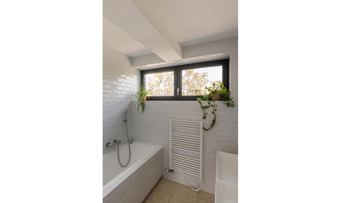 A vederlo, il camino ricorda la linea di arredi Quaderna di Zanotta, disegnata da Superstudio a fine Anni ’70. «L’ispirazione non è esattamente quella» dice Jana Benková, architetta dello Studio Benkobenkova assieme al marito Juraj Benko (seguili su IG @benkobenkova). «Però sì, è vero, è uno stile che si rifà agli Anni ’60-’70 e che funziona benissimo ancora oggi! Una volta realizzata la struttura in muratura attorno al focolare, l’abbiamo rivestita di piastrelline bianche da cm 5x5 e colorato le fughe di rosso terracotta».