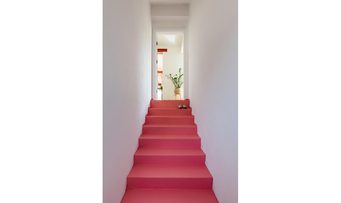 Ricorda: anche gli spazi di passaggio si possono nobilitare! Dipinta di un rosa acceso (copialo con il colore cod. Ral 3027 Raspberry Red), la semplicissima scala in cemento che conduce