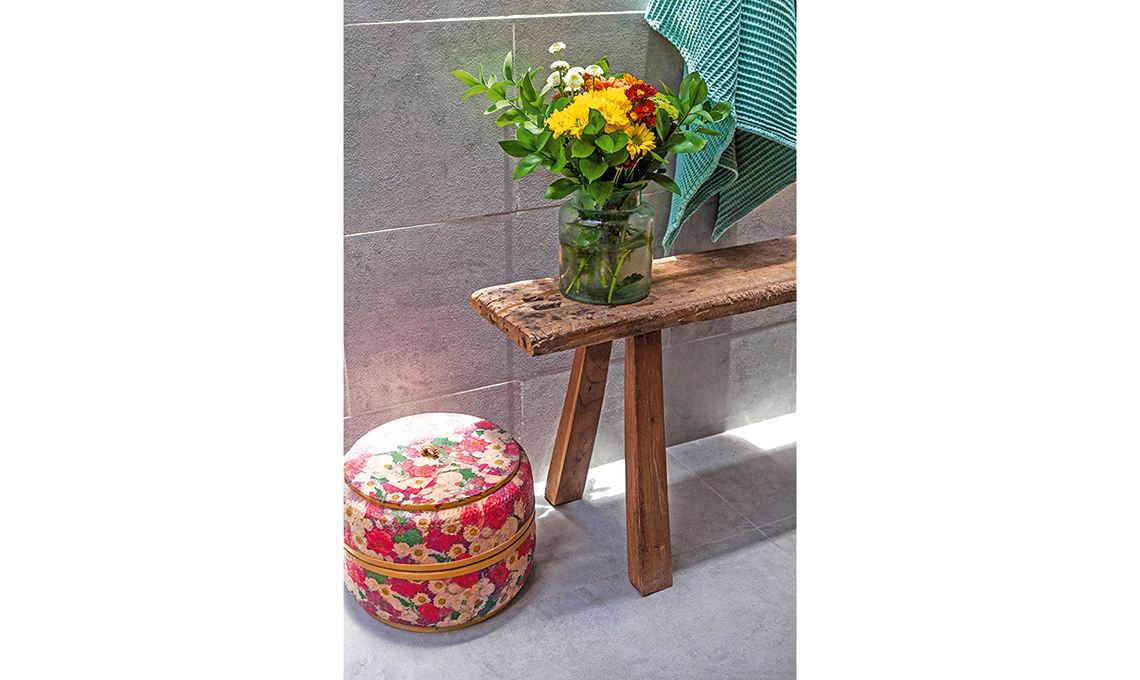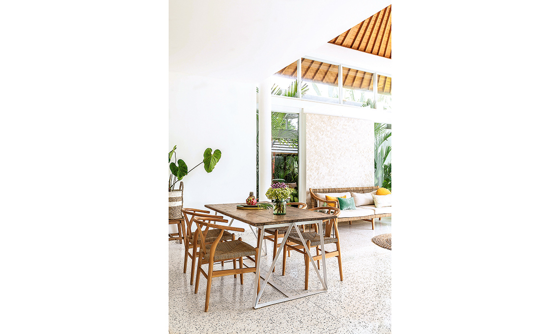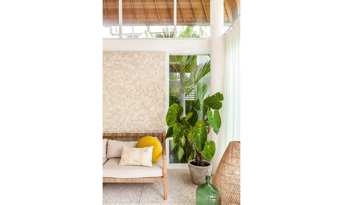 Si chiamano 'Banten' le tradizionali offerte religiose preparate dagli abitanti di Bali e racchiuse in cesti decorati, che qui diventano preziosi elementi d’arredo. Oggetti tipici e panche vintage non stonano affatto