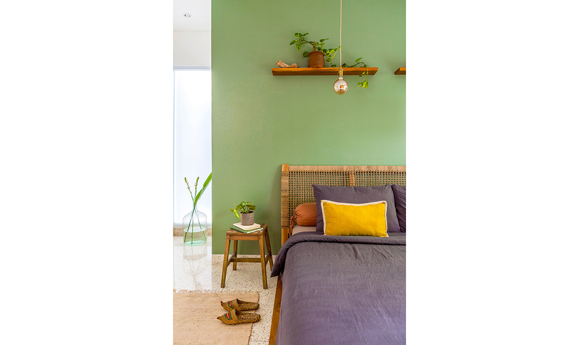 La parete verde dà un tono deciso alla prima camera da letto: i materiali sono ‘rough’, i colori intensi, gli arredi essenziali. Il