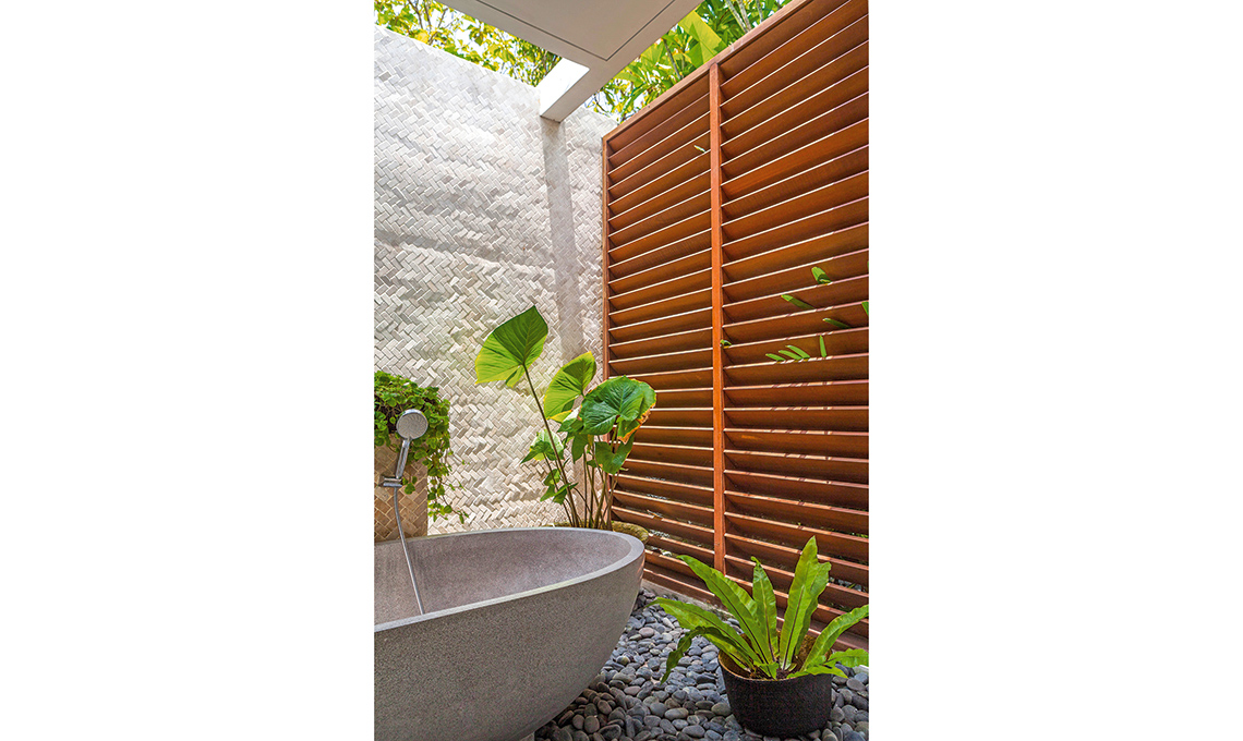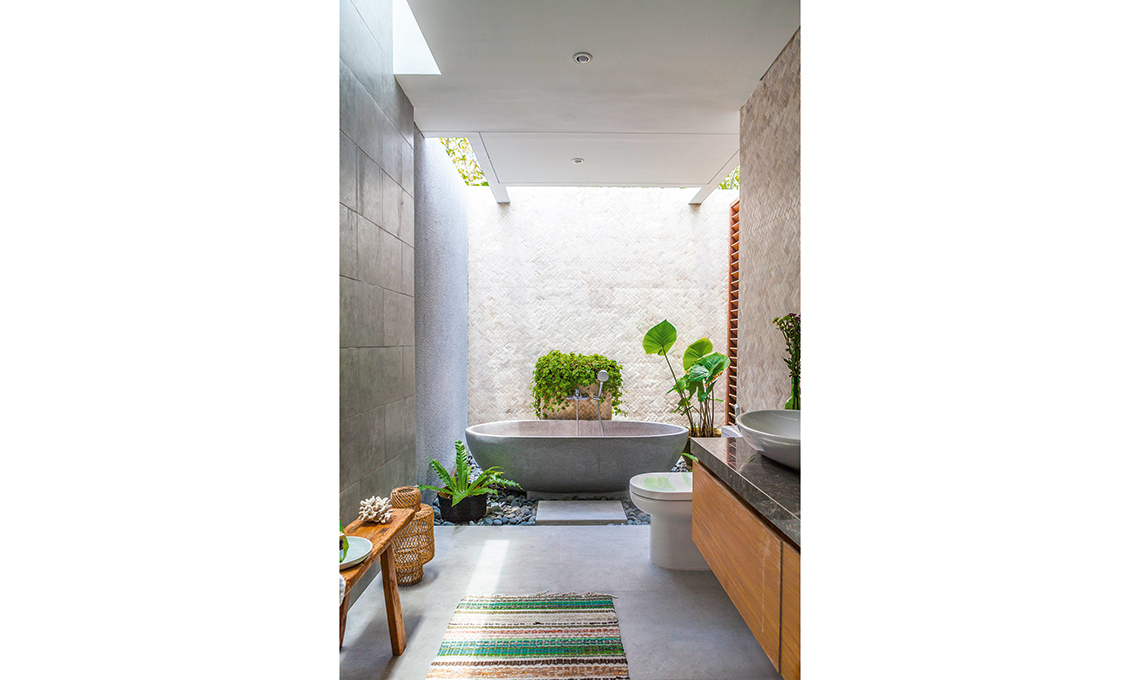 Il living a doppia altezza è affacciato sulla piscina: una scelta insolita da noi, ma vincente in un clima tropicale dove il refrigerio dell’acqua è indispensabile. Originali anche i due bagni ‘en suite’ che prendono luce e aria dall’alto.