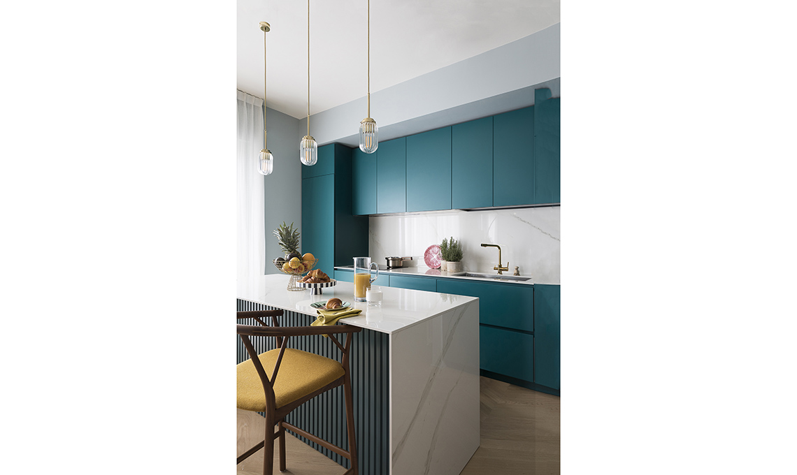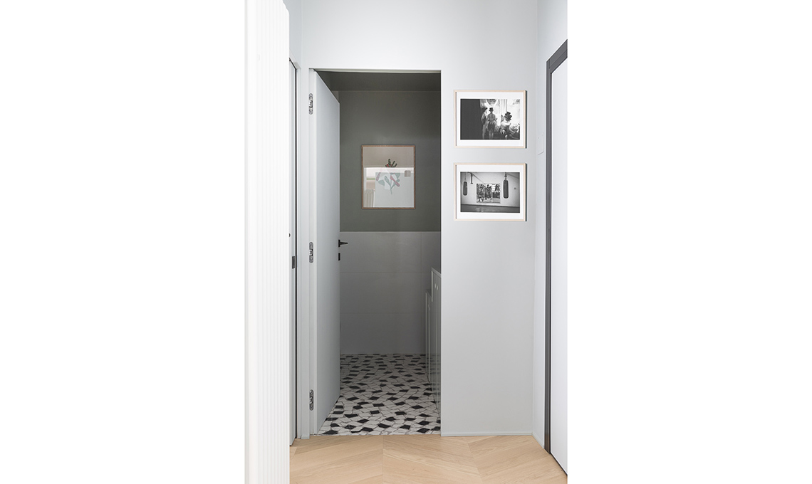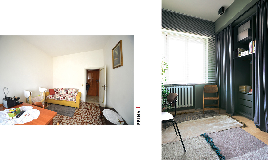 L’abitazione era distribuita in diverse stanze e mancava un vero e proprio salotto, che oggi invece occupa il cuore della casa e fa da filtro a due zone completamente disimpegnate: la camera padronale con bagno e cabina armadio, e lo studio con bagno di servizio ritagliati esattamente dalla parte opposta, così da garantire un’adeguata privacy a eventuali ospiti.