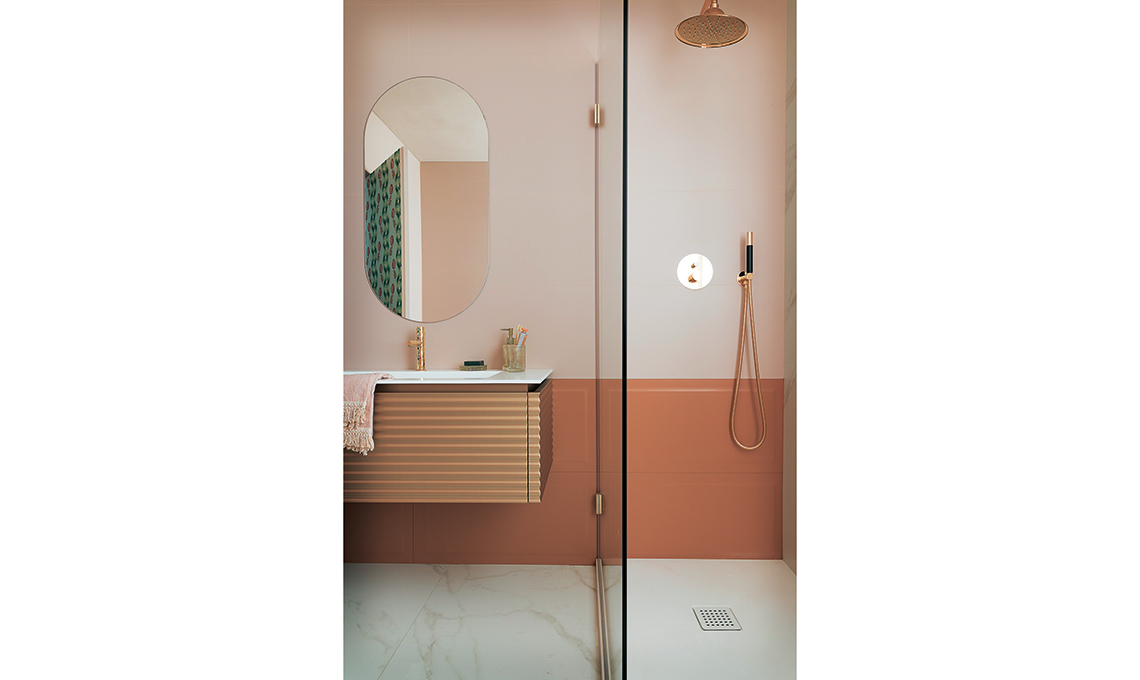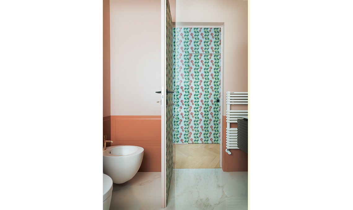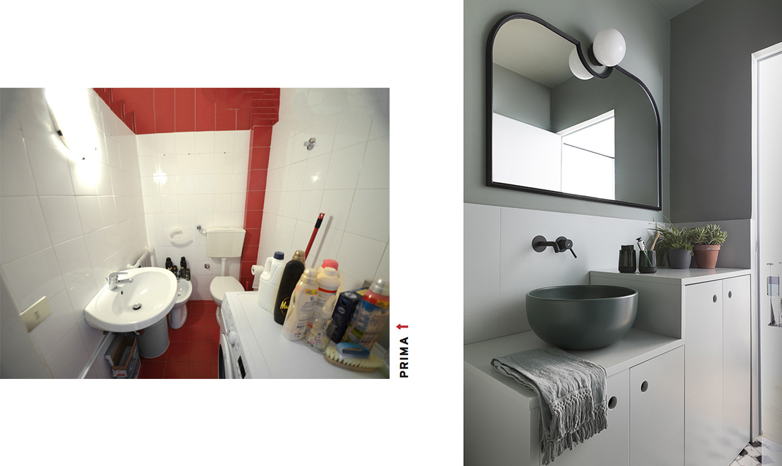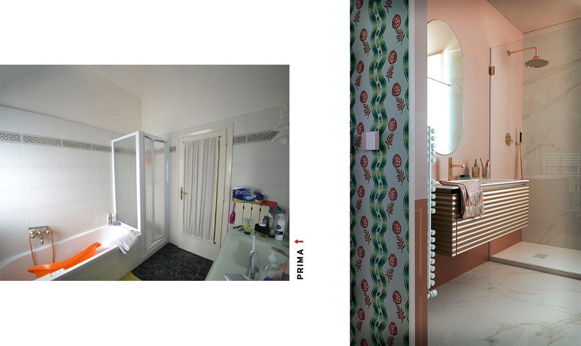 Il bagno era una tela bianca e ingrigita. Poi Paola ha scelto questa combinazione di piastrelle rosa&terracotta e ad Atypique Design Studio è toccato l’arduo compito di collegare i verdi del living ai rosa del nuovo bagno... «Usiamo la carta da parati?» ci siamo dette...