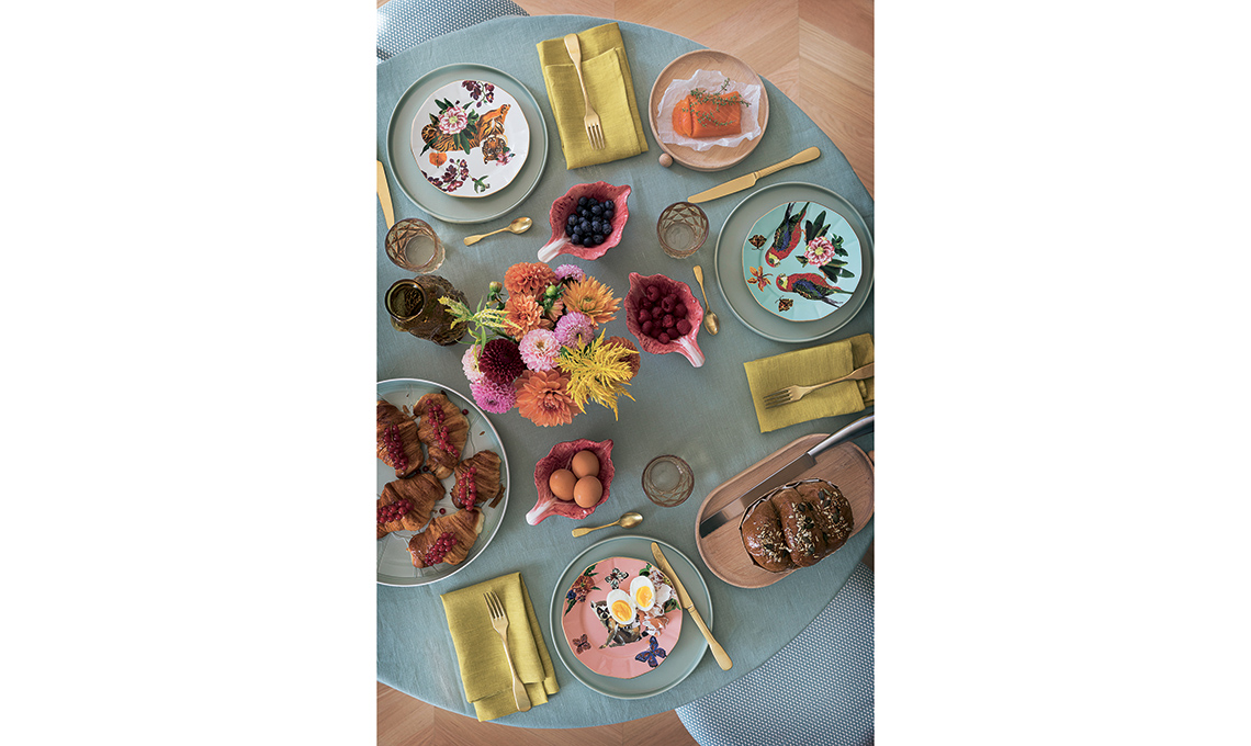 Sul tavolo, tovaglia e tovaglioli [Borgo delle Tovaglie], posate Brick Lane, piatti Lunch Layers, coltello tutto di [KnIndustrie]. vassoi in legno Inka Wood Tray Nature [Oyoy], piatti dolce con decori di Nathalie Lété, collezione Titania da [Anthropologie], ciotole Radicchio [Les-Ottomans], fiori di [Puscina Flowers].