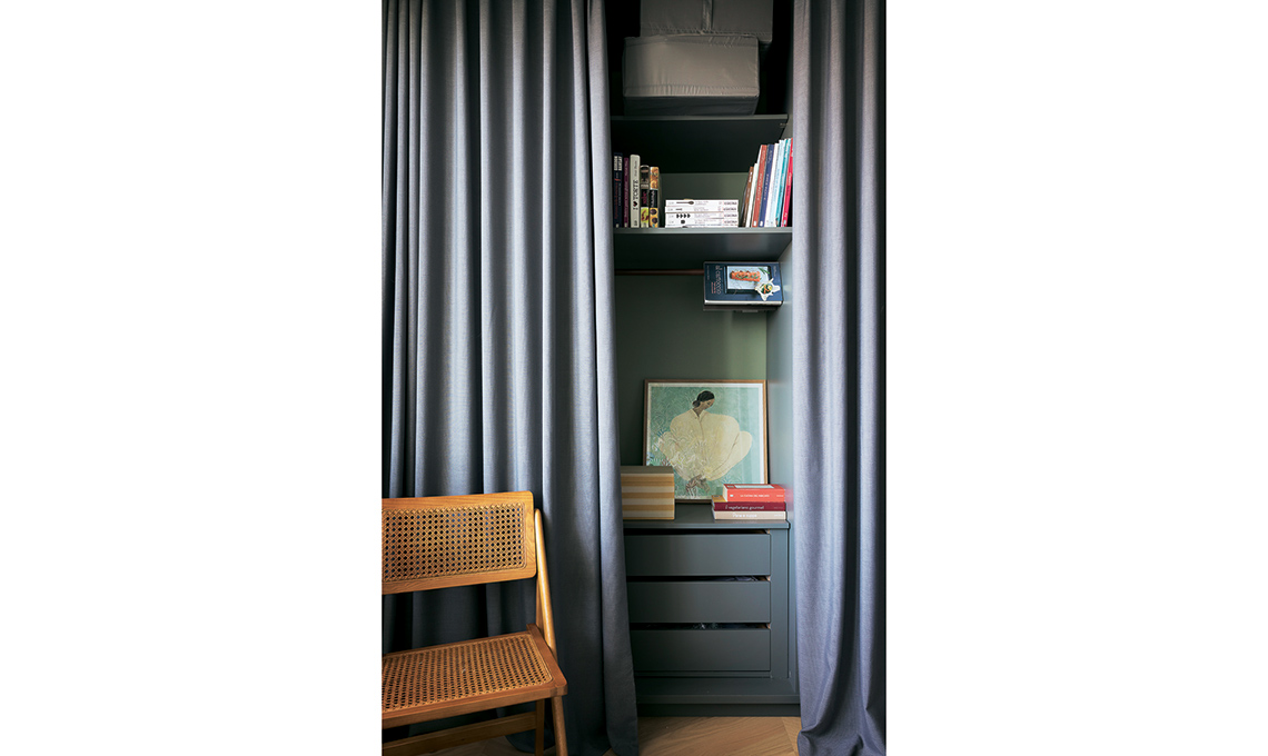 Lo studio, insieme alla cucina, è la stanza dove Paola trascorre più ore: scrive le sue ricette, aggiorna il blog, risponde ai clienti... Il primo arredo è stato l’armadio della mamma, un enorme pezzo di noce Anni ’70 che è stato smontato, rilaccato di grigio antracite e rimontato senza le ante. Ad adornarlo oggi c’è una tenda elegante e praticissima: dietro sono nascoste persino le brande per gli ospiti!
