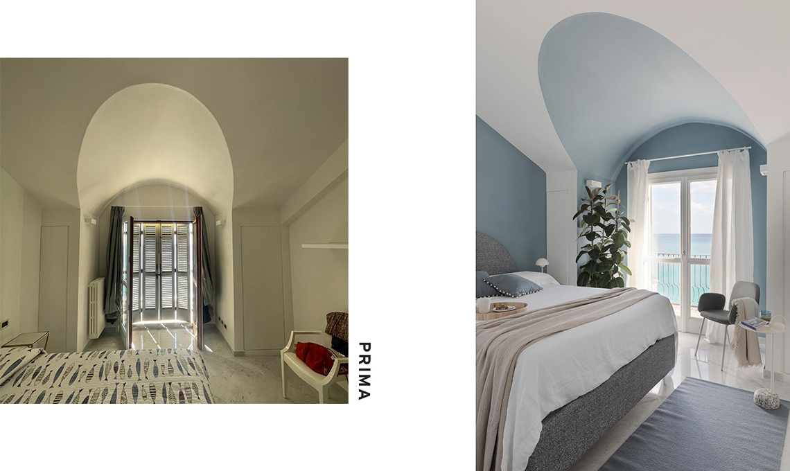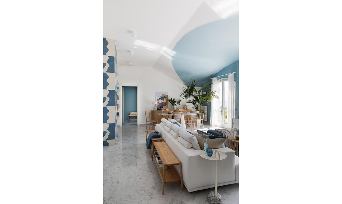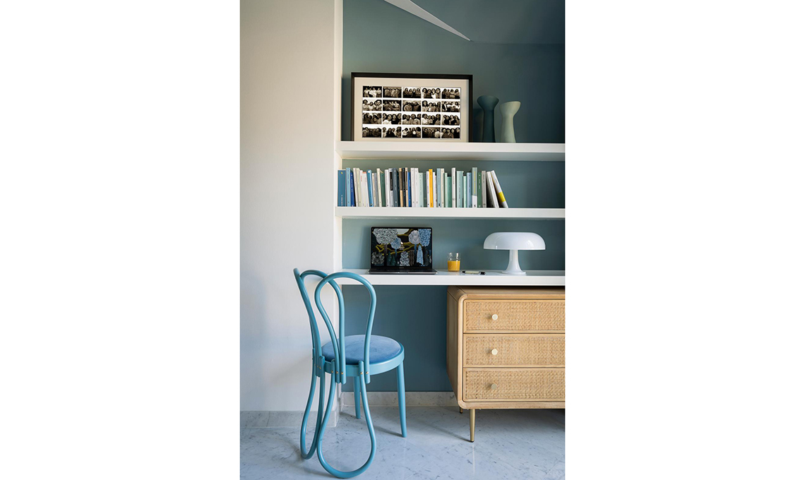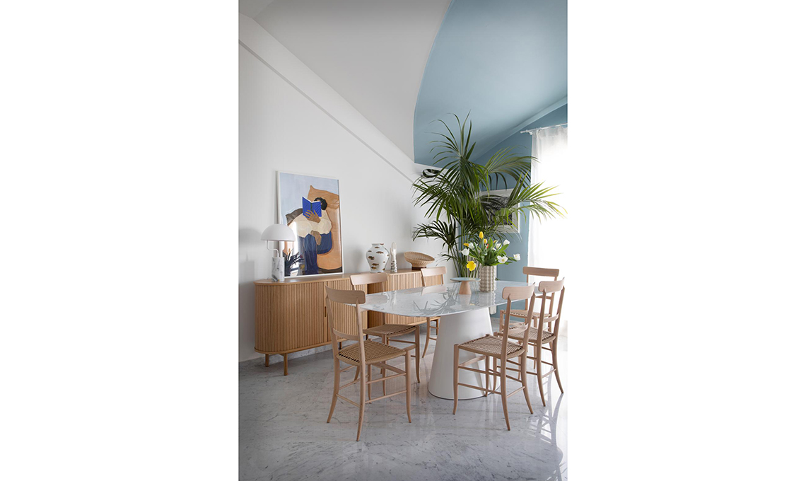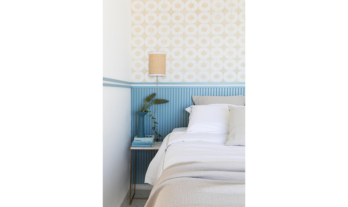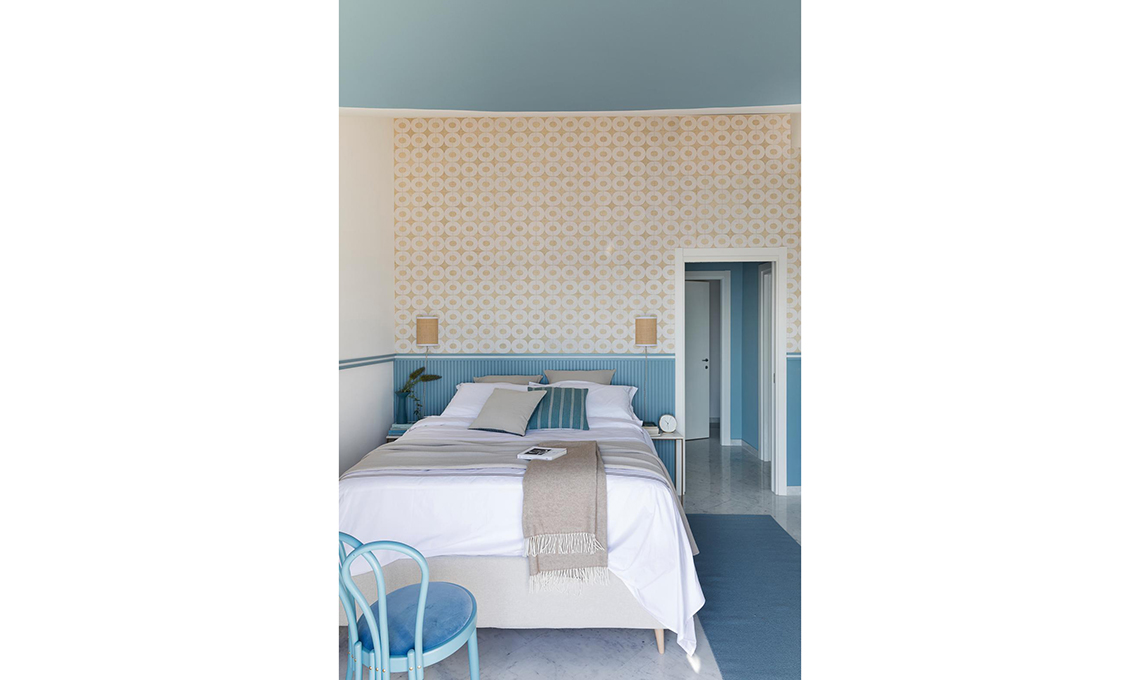 L’appartamento ha volte simili a onde che incorniciano le finestre. Dipingerle di azzurro ha dato valore a un elemento strutturale e ha aggiunto movimento agli ambienti; nel living, fa eco la tappezzeria dalle geometrie sinuose. In camera, la boiserie, al posto della testata del letto, fa da base alla carta da parati in rafia intrecciata che rende l’ambiente avvolgente ed elegante.