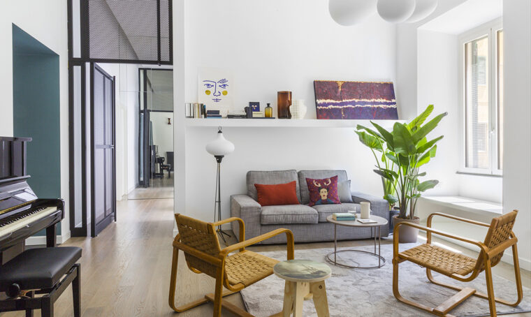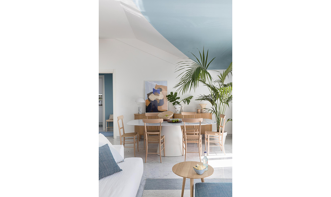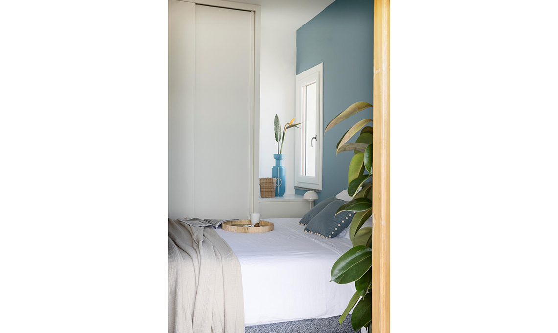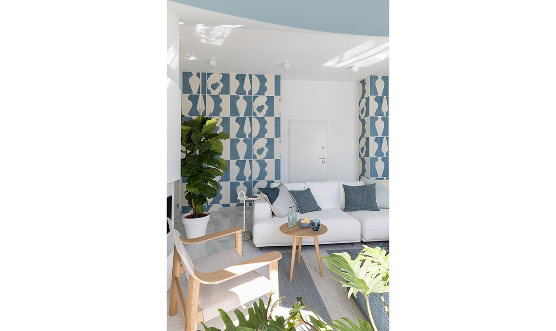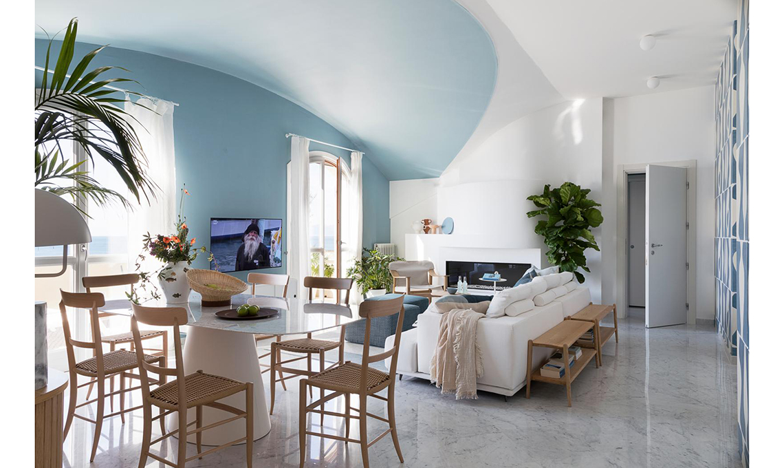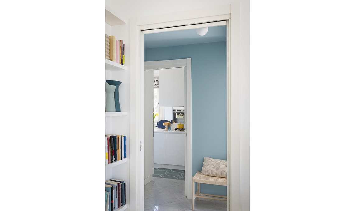 L’appartamento ha volte simili a onde che incorniciano le finestre. Dipingerle di azzurro ha dato valore a un elemento strutturale e ha aggiunto movimento agli ambienti; nel living, fa eco la tappezzeria dalle geometrie sinuose. In camera, la boiserie, al posto della testata del letto, fa da base alla carta da parati in rafia intrecciata che rende l’ambiente avvolgente ed elegante.