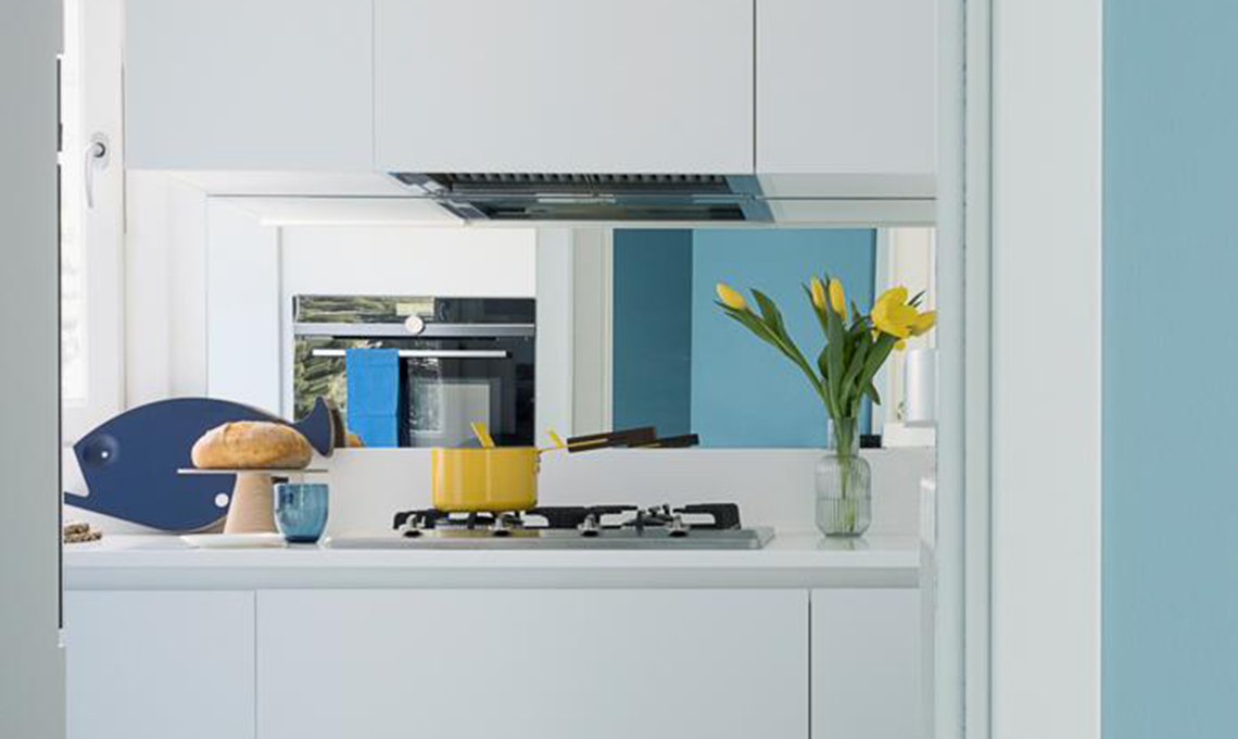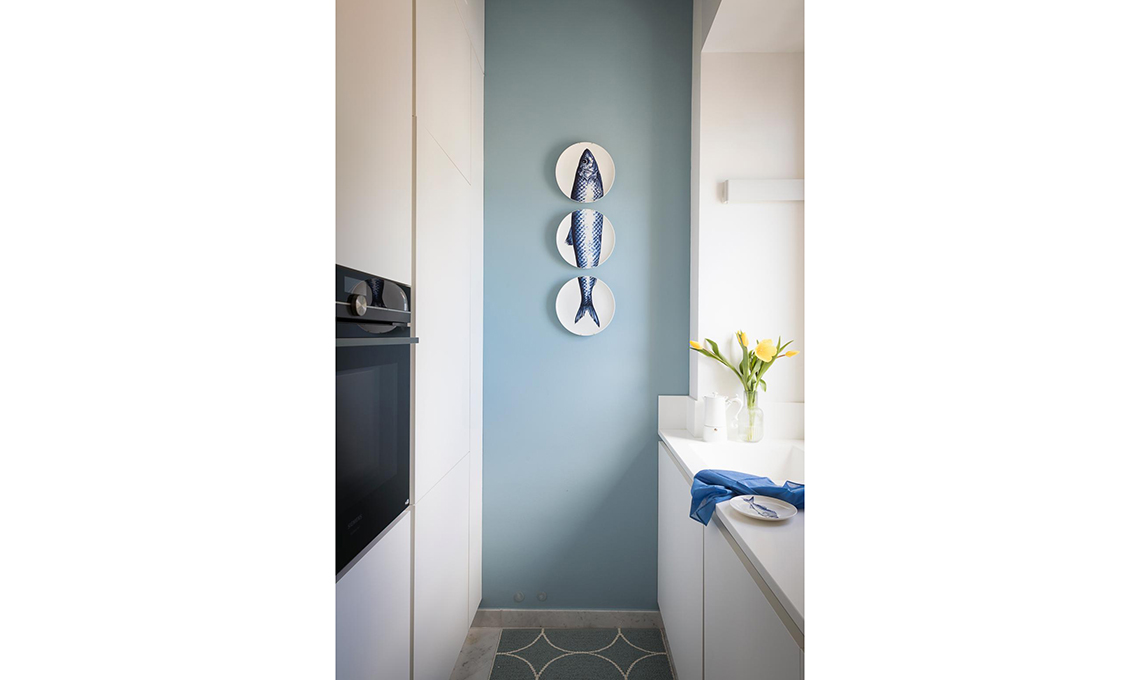 Piccola ma ben organizzata, anche la cucina era total white. Vanessa l’ha personalizzata dipingendo le pareti in azzurro, inserendo pentole e accessori in legno e colorati più una passatoia grafica sul pavimento, con un decoro a cerchi che riprende il motivo e la nuance dei piatti appesi
