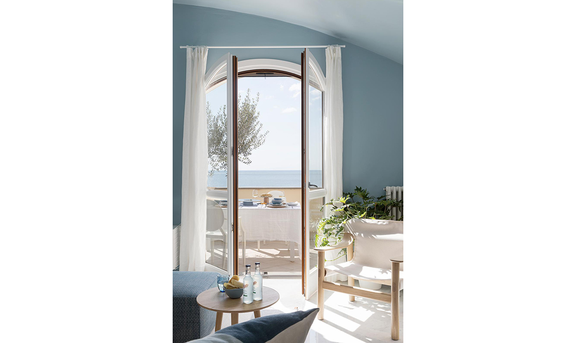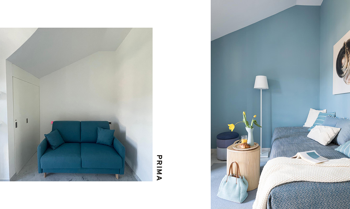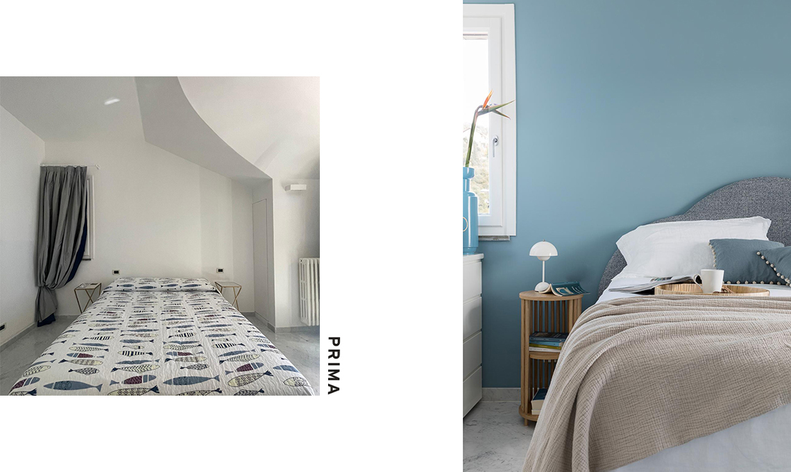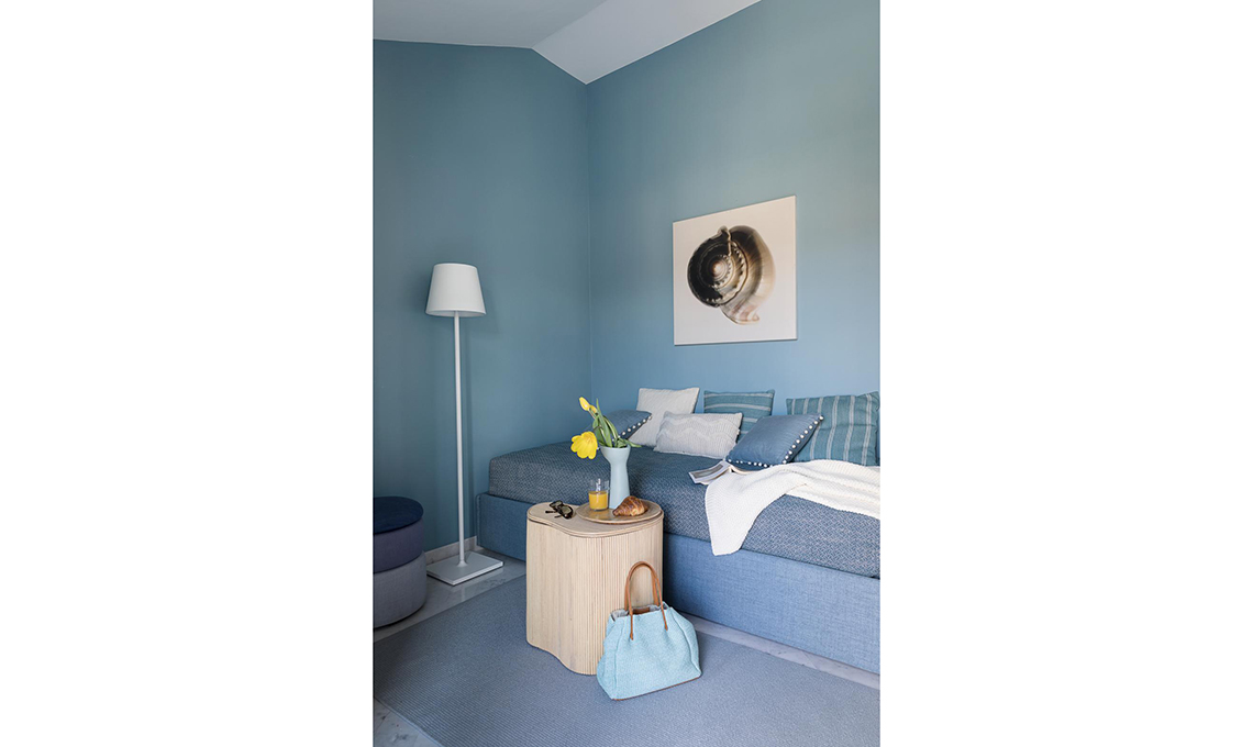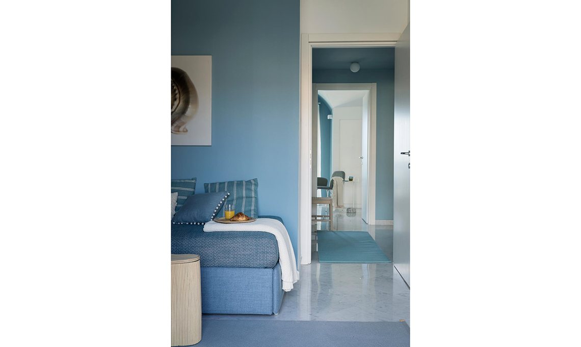 «Per risolvere il problema del contenimento ho fatto realizzare nuovi armadi su misura e riorganizzato gli interni di quelli esistenti: ora quasi nulla è lasciato a vista e si ha sempre un senso di ordine e relax» spiega la stylist. «Poi sono passata allo stile. Se, come in questo appartamento, la vista del mare che ‘tocca’ il cielo è protagonista, è naturale giocare con la palette degli azzurri. Nelle case al mare è una scelta quasi scontata, ma perché non venisse percepita come fredda e quindi poco accogliente l’ho abbinata a mobili in rovere e faggio, con nuance che ricordano la sabbia, e a tessili e carte da parati a trama grossa: le texture materiche trasmettono una sensazione di morbidezza e di autenticità».