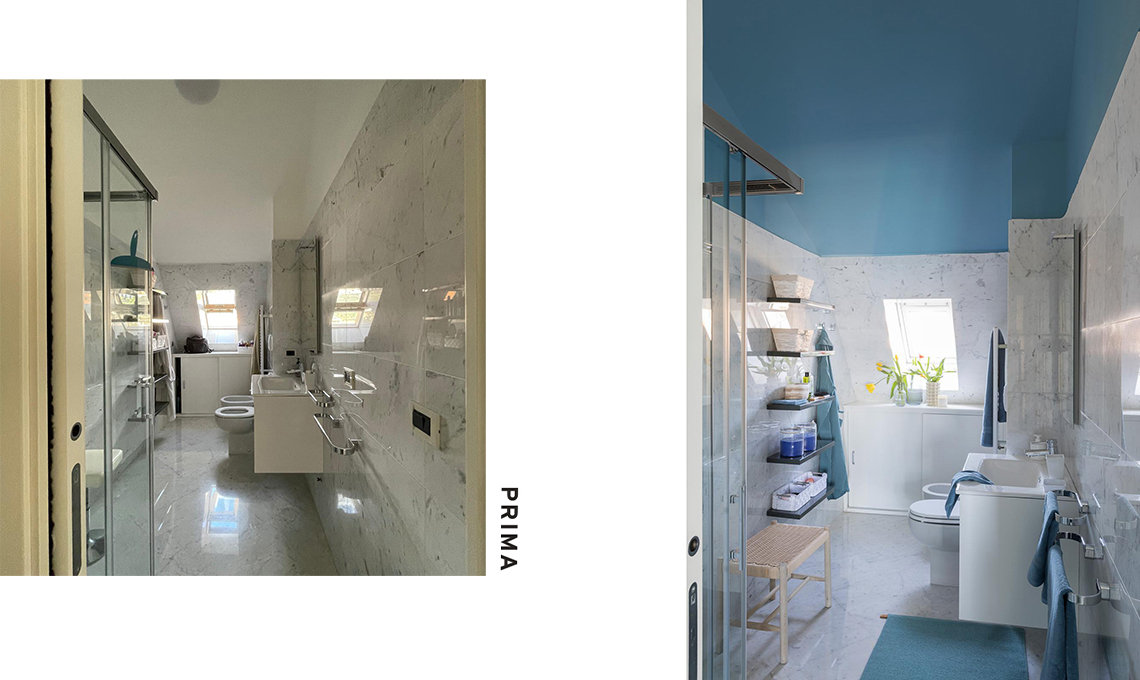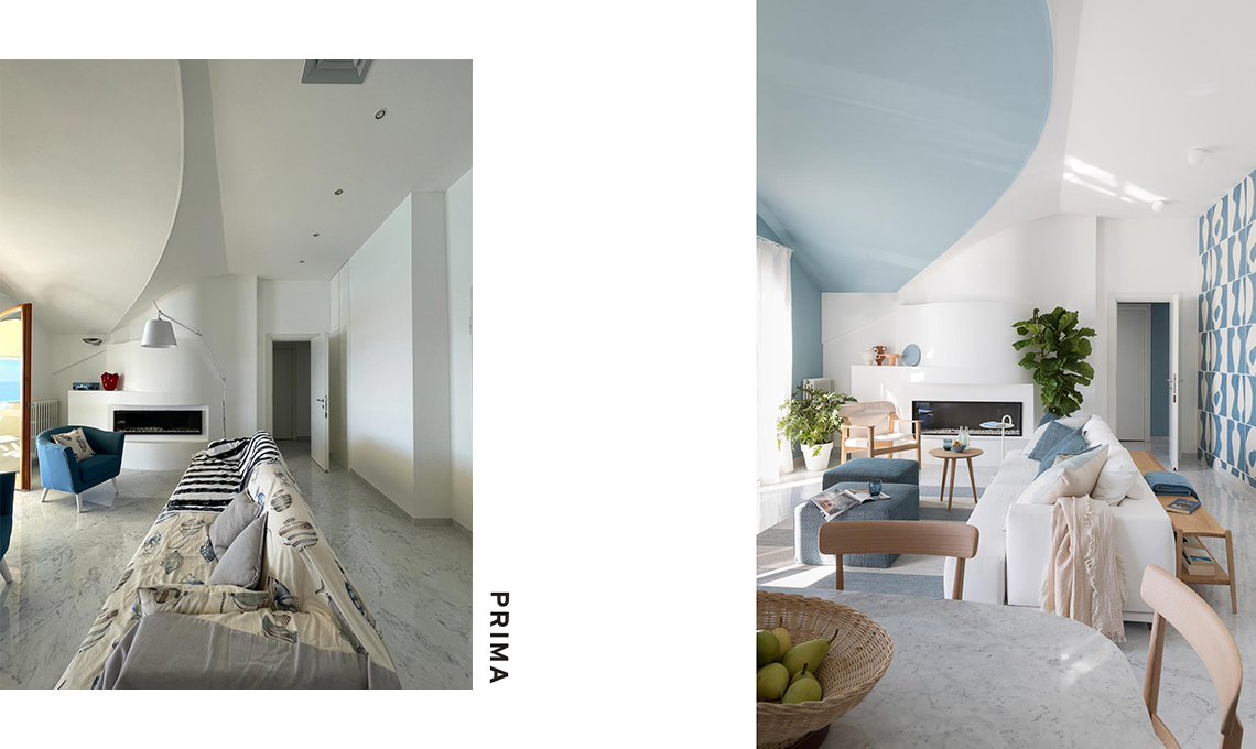 Il pavimento in marmo di Carrara era indubbiamente elegante, ma con le pareti e i mobili bianchi più che creare armonia rendeva il soggiorno un po’ freddo e impersonale. Il punto di svolta? Una palette di azzurri luminosi abbinata a pezzi in legno chiaro che danno un tocco ‘caldo’ e sempre elegante