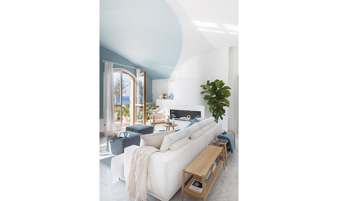 Dietro il sofà, panche in frassino [Zara Home, cm 115x32x43h] con asciugamano blu [Croff], tavolino Bowler con base in granito [Hay da Arcarreda]. A soffitto, lampade Dioscuri in vetro soffiato [Artemide, ø cm 14]. idropittura azzurra codice colore R1.10.65 [Sikkens]. Piante in tutta la casa [Fratelli Ingegnoli].