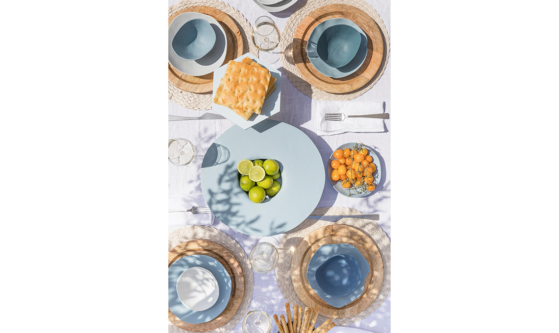 bianchi in puro lino, tovagliette lavorate, piatti in legno e calici tutto [Croff], posate Zest in acciaio inox stone washed [KnIndustrie], piatti, ciotole Onda e centrotavola azzurri e blu [Laesse], alzata Tavolino-ino Esagonale [WFTB, ø cm 12x32h]. .