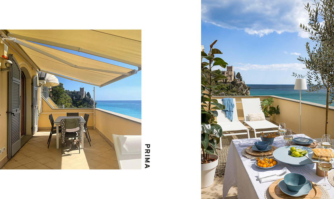paio di sdraio. Vanessa l’ha riorganizzato per renderlo sfruttabile sia come zona relax per prendere il sole sia come sala da pranzo vista mare, riutilizzando qui le sedie che prima erano dentro. In linea con il décor della casa, anche l’apparecchiatura è fresca e semplice. Sedie Louis Ghost [Kartell], piantana Poldina XXL [Zafferano], salvietta e cuscino sulle sdraio [Croff].