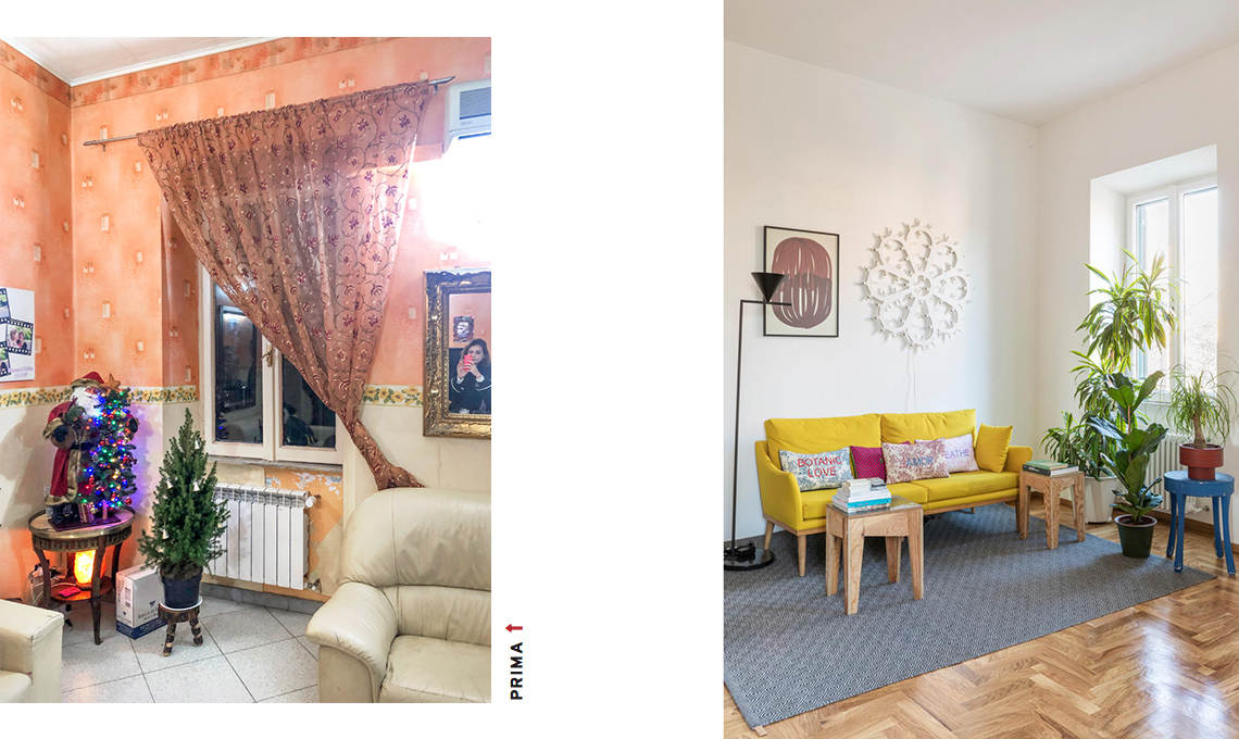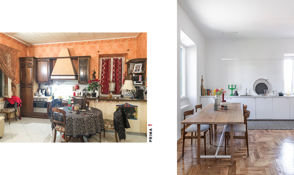 Tappezzeria arancione, tende damascate, boiserie con greca a fiori più un pavimento in piastrelle molto freddo... Con un bellissimo parquet posato a spina italiana in legno massello, il bianco totale sulle pareti e i nuovi infissi tutto si è fatto più elegante e luminoso, pur restando semplice. Sono i dettagli a fare la differenza: il calore del tavolo in legno naturale, il tocco vitaminico del divano giallo, le geometrie dei