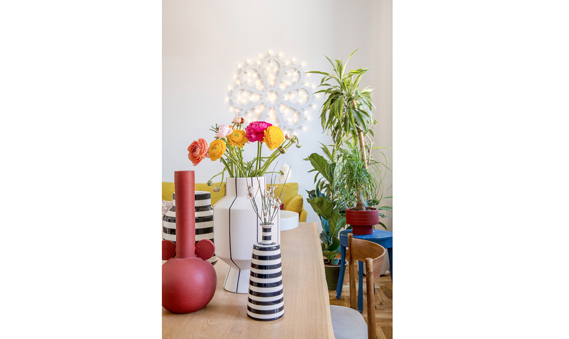 con una palette di colori e pattern di ispirazione vintage» dice Cristina. «È nato così l’ensemble di vasi che hanno silhouette inedite, mini e maxi righe in black&white, tinte unite calde come il rosa e squillanti come il giallo. Sono nuance che ritroviamo in tutta la casa: in uno spazio dai confini labili i richiami cromatici sono d’ordinanza».