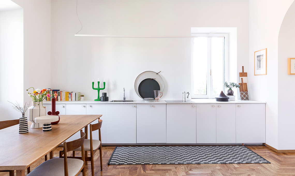 Le basi della cucina Metod [Ikea] sono completate da un top in Fenix NTM bianco e dai pomelli Hook Marble Small [Ferm Living, ø cm 2]. Sul piano: caffettiera Lady Anne, vassoi Live-Ly [ø cm 50] e [ø cm 67] più tajine Glocal, tutto di [KnIndustrie] come i taglieri. Brocca in vetro [Bitossi Home]. Incorniciata, un’illustrazione di Guido Pigni; sospensione Barra Led [Linea Light].