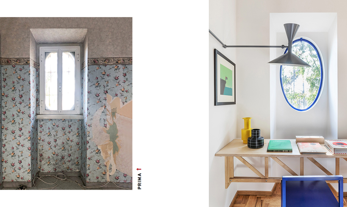 Coperta da un infisso interno, la finestra ovale originale degli Anni ’20 scompariva totalmente alla vista. Aurora, al contrario, l’ha voluta rendere protagonista dello studio togliendo tutto ciò che non serviva, comprese le sbarre esterne, e ha fatto realizzare un infisso in un colore davvero unico come il blu Klein che spicca e incornicia la vista proprio come fosse un quadro.