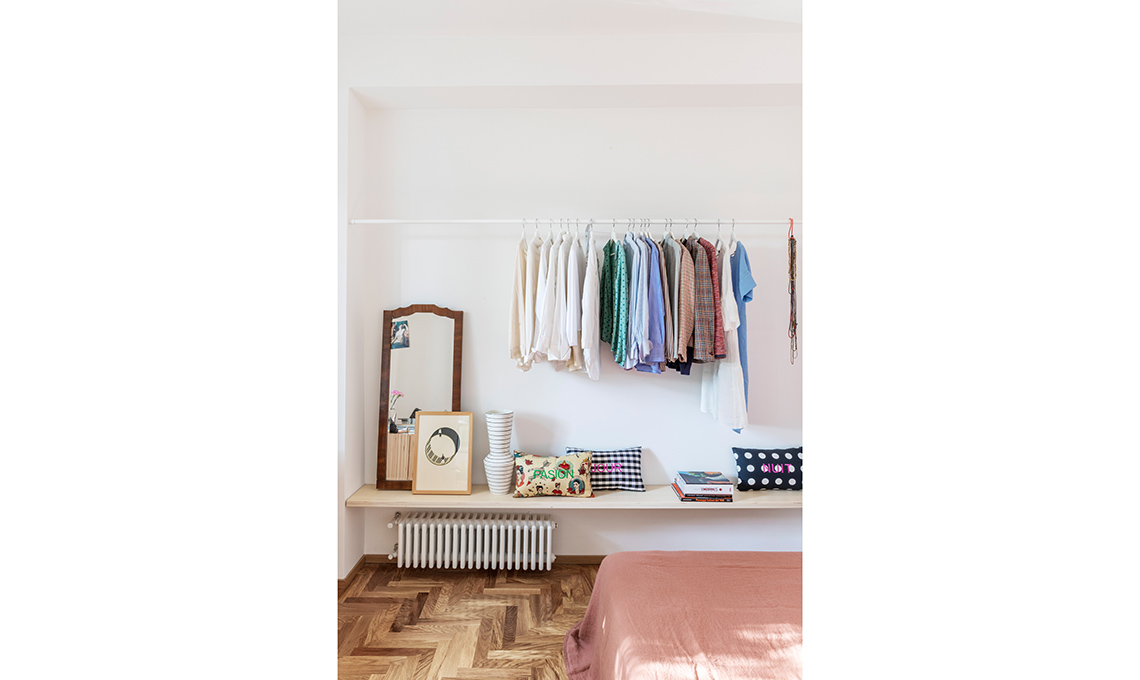 Armadio formato da mensolone e barra appendiabiti realizzato su misura da [Stefano Fratarcangeli Artigiano]. Vaso in ceramica a righe [Mani Ceramics], cuscini in varie fantasie [Eklettikarte] e illustrazione di Giulio Bonasera.