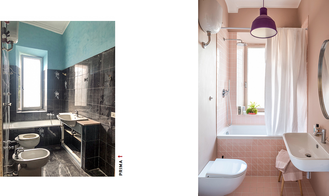 Piastrelle rosa a pavimento e nella zona vasca [Ceramica Vogue], sanitari della serie Sfera di [Catalano], rubinetteria in acciaio cromo [Ideal Standard e Gessi], tenda per la doccia [Society6]. asciugamani sullo sgabello [La Fabbrica del lino], sospensione viola Unfold [Muuto, ø cm 32,5x29,5h].