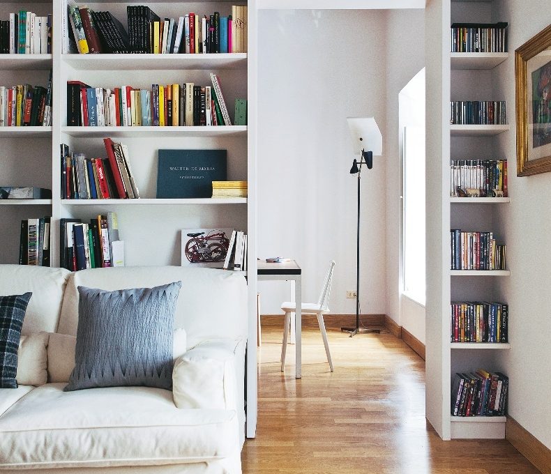 Libreria a ponte con 2 vani di passaggio, progettata dal padrone di casa, lunga 5,5 metri e alta fino al soffitto, realizzata in legno laccato bianco [da €3.000]; sul divano, cuscini in fantasie geometriche sui toni del grigio [Arper]; sul fondo, sedia in legno bianco [Hay, da Mia via Ripetta €190].