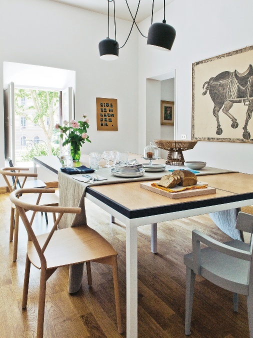 Tavolo da pranzo/ping pong, con top in legno e base in ferro verniciato bianco, disegnato dal proprietario [cm 152x274x76h da €800]; sedie in legno curvato Valerie [Miniforms, cm 56x52x77h da €320]; sedia in legno tinto grigio Cafè [Billiani, da Magazzini Associati, cm 51x48,5x80,5h €237]; sul top, piatti Sorbetto [Bitossi, da €7 il piano]; tagliere in legno [da Dispensabile €65]; portafrutta in legno [Piet Ein Eek da Mia via Ripetta €180]; alzatina, brocca, bicchieri e posate [da c.u.c.i.n.a.]; tessuto coll. Dominique Kieffer [Rubelli]; tovaglioli serie Blow [Fazzini]; sospensione Aim [Flos €499]; mattonella di Davide Monaldi [€100].